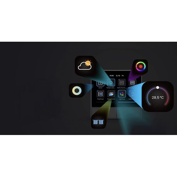 Dzięki współpracy z aplikacją eWeLink możesz monitorować i kontrolować dom z każdego miejsca na świecie. Automatyczne wyłączanie światła o określonej porze czy zdalne zarządzanie urządzeniami nigdy nie było prostsze. Panel wyświetla aktualne informacje o pogodzie, statusie Wi-Fi, czasie, dacie, a także temperaturze wewnętrznej i zewnętrznej. Wszystkie niezbędne dane masz zawsze pod ręką.