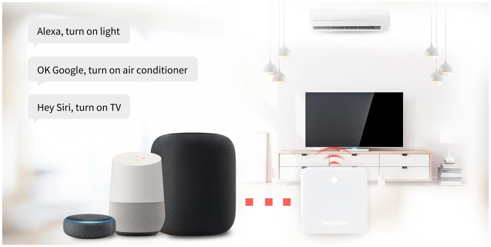Το SwitchBot Hub Mini είναι συμβατό με βοηθούς φωνής: Alexa, Google Assistant και Siri. Χάρη σε αυτό, είναι δυνατός ο έλεγχος προϊόντων SwitchBot και οικιακών συσκευών (χρησιμοποιώντας υπέρυθρες) χρησιμοποιώντας απλές φωνητικές εντολές.