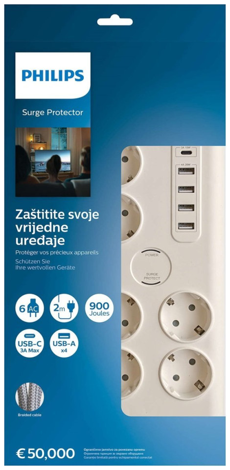 Philips Πολύπριζο 6 υποδοχών χωρίς γείωση +USB C Philips schuko SPN7060WA/58