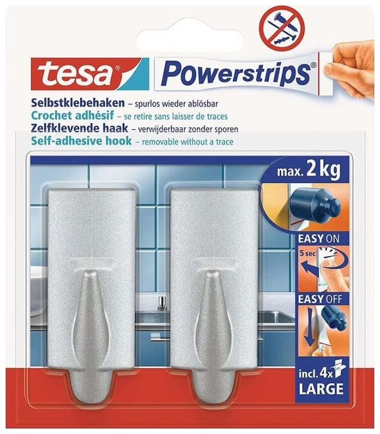 Tesa Αυτοκόλλητοι γάντζοι powerstr. 2 τεμ. ορθογώνιοι, μεγάλοι, ματ χρώμιο