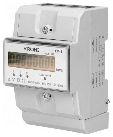 Μια συσκευή για την πραγματοποίηση ενδείξεων σε μετρικές μονάδες (kWh) χρησιμοποιείται για την άμεση μέτρηση της ενεργού ισχύος σε ένα τριφασικό σύστημα. Ένα ειδικό ηλεκτρονικό σύστημα, υπό την επίδραση του ρέοντος ρεύματος και της εφαρμοζόμενης τάσης, παράγει παλμούς σε ποσότητα ανάλογη με την ηλεκτρική ενέργεια που καταναλώνεται. Η κατανάλωση ενέργειας σε μια φάση υποδεικνύεται από το LED που αναβοσβήνει. Ο αριθμός των παλμών μετατρέπεται σε ενέργεια που καταναλώνεται και η τιμή του υποδεικνύεται από την οθόνη LCD (6+2). Τροφοδοσία: 230V~, 50Hz, ρεύμα βάσης: 5A, μέγ. ρεύμα: 80A, min. ρεύμα: 0,25A, συχνότητα παλμού: 800 imp/kWh, κλάση ακρίβειας Β, περίβλημα πλάτους τριών μονάδων, τοποθέτηση σε ράγα DIN TH-35 mm, έξοδος παλμού: τροφοδοτικό 12 ~ 27V, ρεύμα ?27mA, παλμός = 80ms.{Τύπος} Μετρητές ενέργειας - ηλεκτρονικοί