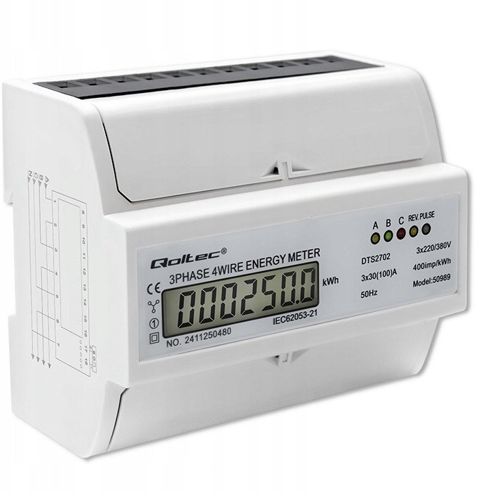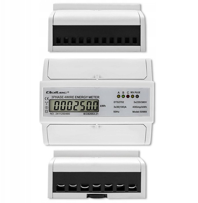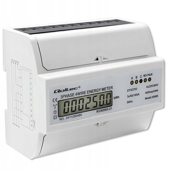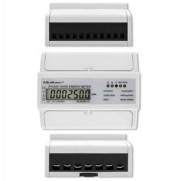 Ηλεκτρονικός μετρητής δύο κατευθύνσεων 3 φάσεων Qoltec | μετρητής κατανάλωσης ενέργειας για ράγα DIN | 400V | 100A | LCD | 4P
