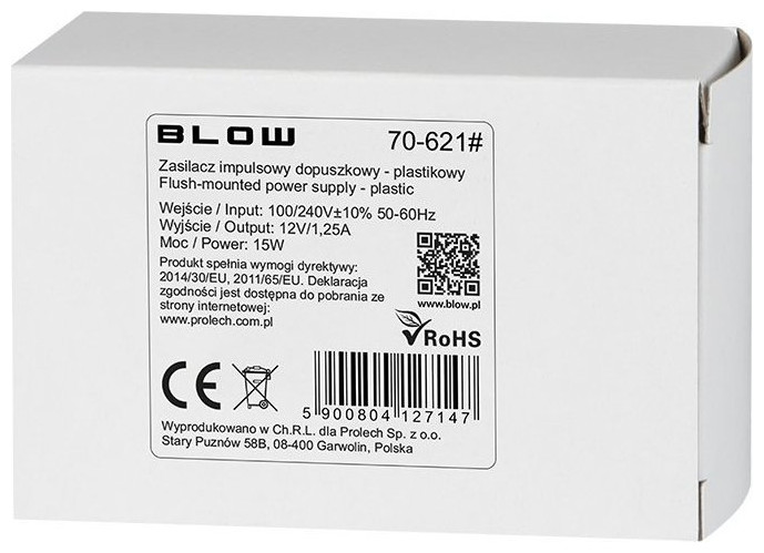 Specyfikacja:Napięcie wejściowe: 100-240V +/-10%, 50-60HzNapięcie wyjściowe: 12V / 1,25AMoc: 15WKlasa szczelności: IP67Materiał obudowy: plastik Kolor obudowy: czarny Certyfikaty: CE, RoHS Wymiary: średnica 58mm x wysokość 48mm x grubość 24mmDługość przewodu: 15cm Zasilacz impulsowy dopuszkowy wodoszczelny z możliwością instalacji w puszkach podtynkowych. Idealnie sprawdzi się do zasilania taśm i modułów LED, paneli, listew czy żarówek LED, a także do wielu innych urządzeń elektronicznych zasilanych napięciem 12V. Najważniejsze zalety: - Szeroki zakres napięć wejściowych - Wysoka jakość wykonania- Mocna i trwała obudowa- Niezbędne certyfikaty bezpieczeństwa- Szeroki zakres zastosowań- Klasa szczelności: IP67- Idealne do puszek Ø60