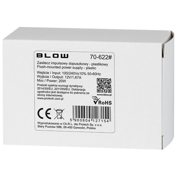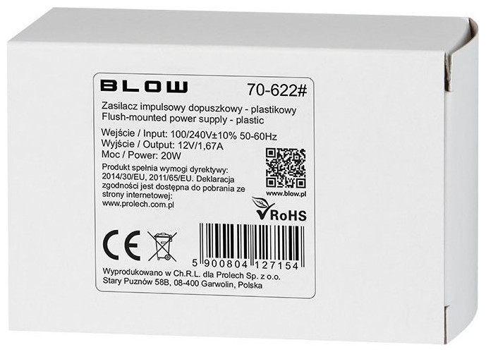 Specyfikacja:Napięcie wejściowe: 100-240V +/-10%, 50-60HzNapięcie wyjściowe: 12V / 1,67AMoc: 20WKlasa szczelności: IP67Materiał obudowy: plastik Kolor obudowy: czarny Certyfikaty: CE, RoHS Wymiary: średnica 58mm x wysokość 48mm x grubość 24mmDługość przewodu: 15cm Zasilacz impulsowy dopuszkowy wodoszczelny z możliwością instalacji w puszkach podtynkowych. Idealnie sprawdzi się do zasilania taśm i modułów LED, paneli, listew czy żarówek LED, a także do wielu innych urządzeń elektronicznych zasilanych napięciem 12V. Najważniejsze zalety: - Szeroki zakres napięć wejściowych - Wysoka jakość wykonania- Mocna i trwała obudowa- Niezbędne certyfikaty bezpieczeństwa- Szeroki zakres zastosowań- Klasa szczelności: IP67- Idealne do puszek Ø60