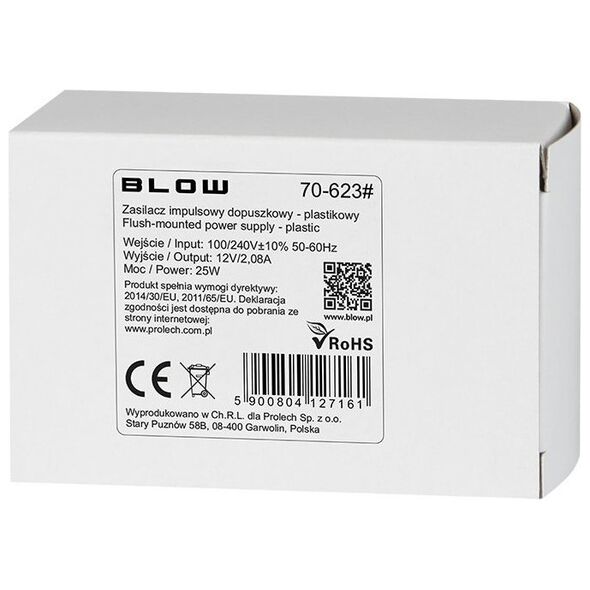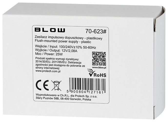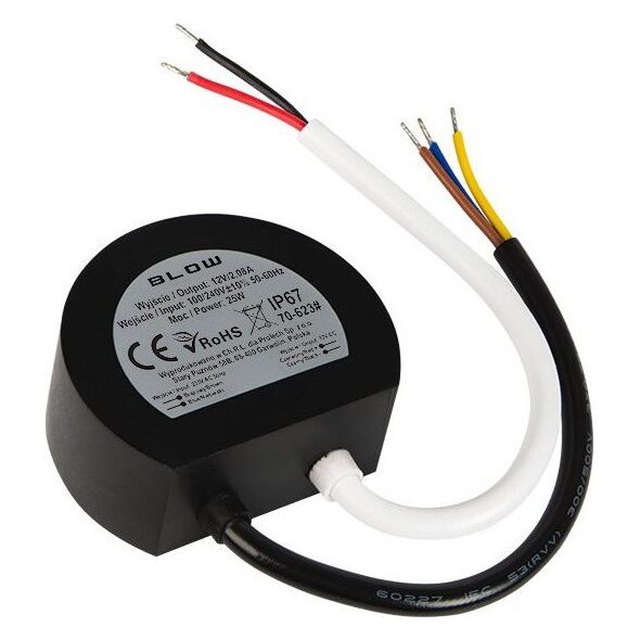 Specyfikacja:Napięcie wejściowe: 100-240V +/-10%, 50-60HzNapięcie wyjściowe: 12V / 2,08AMoc: 25WKlasa szczelności: IP67Materiał obudowy: plastik Kolor obudowy: czarny Certyfikaty: CE, RoHS Wymiary: średnica 58mm x wysokość 48mm x grubość 24mmDługość przewodu: 15cm Zasilacz impulsowy dopuszkowy wodoszczelny z możliwością instalacji w puszkach podtynkowych. Idealnie sprawdzi się do zasilania taśm i modułów LED, paneli, listew czy żarówek LED, a także do wielu innych urządzeń elektronicznych zasilanych napięciem 12V. Najważniejsze zalety: - Szeroki zakres napięć wejściowych - Wysoka jakość wykonania- Mocna i trwała obudowa- Niezbędne certyfikaty bezpieczeństwa- Szeroki zakres zastosowań- Klasa szczelności: IP67- Idealne do puszek Ø60