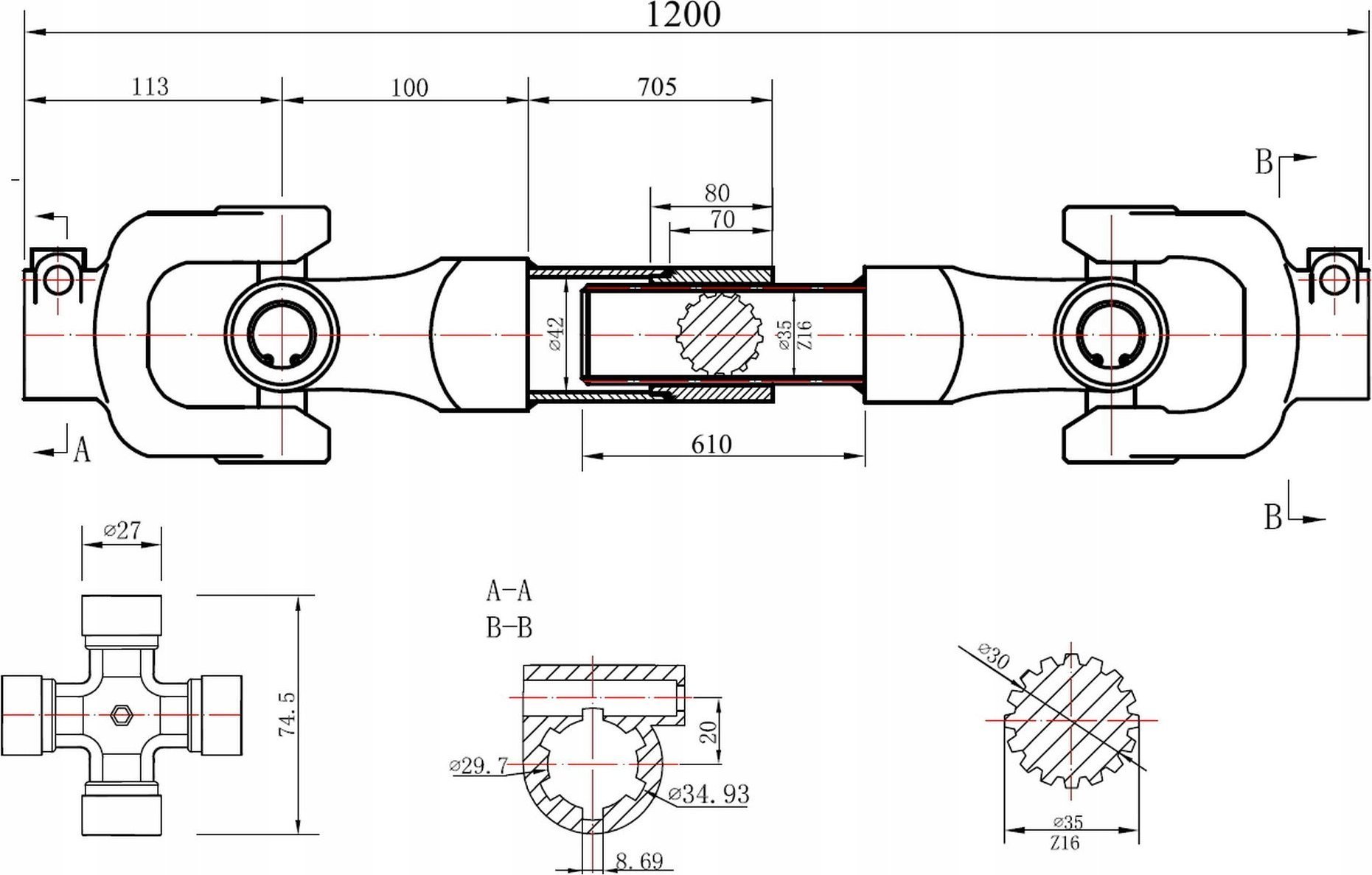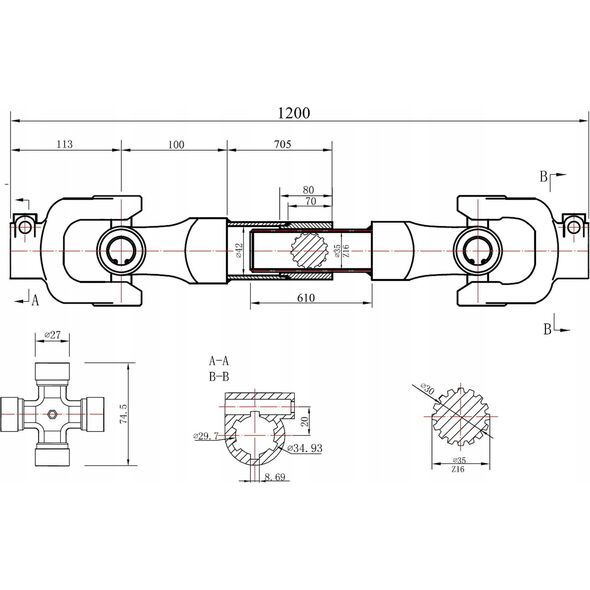 Άξονας πομπού ισχύος 100 cm τύπος Κόφτης Τεχνικές προδιαγραφές: Τύπος: φρεζάρισμα Μήκος μη εκτεταμένου άξονα: 1000 mm Μήκος εκτεταμένου άξονα (με αλυσίδα): 1120 mm Μέγιστη ροπή: 600 Nm Γενικές αρθρώσεις: 27 x 74,5 mm 30 για μηχανές με ισχύ - 47 HP
