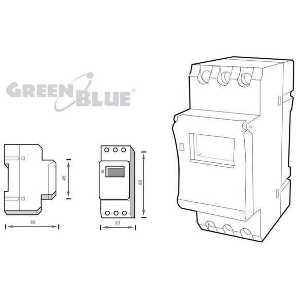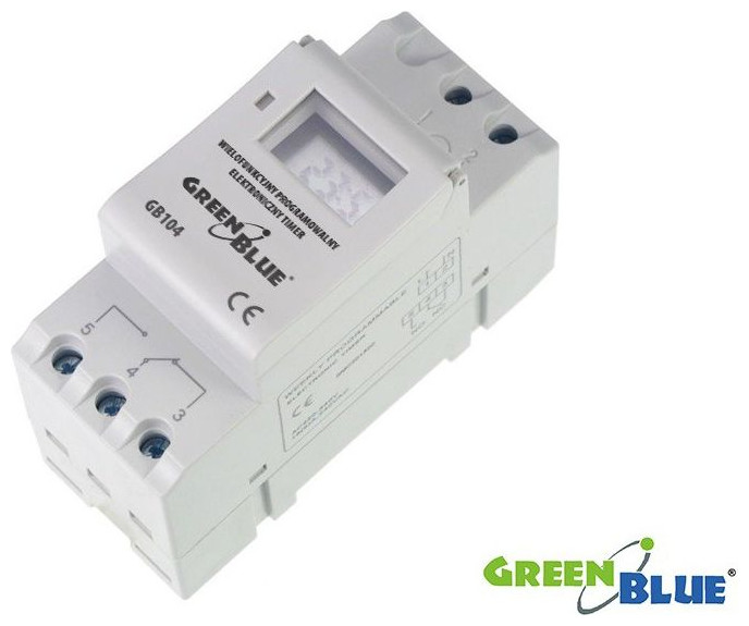 Διακόπτης χρονοδιακόπτη - ψηφιακό χρονόμετρο για ράγα DIN GreenBlue GB104 16 προγράμματα έως 240 προγράμματα Χαρακτηριστικά προϊόντος: - Εγκατάσταση ράγας DIN - Προηγμένος προγραμματισμός με μια εβδομάδα νωρίτερα - Ψηφιακός ηλεκτρονικός γενικός διακόπτης με καθημερινά και εβδομαδιαία προγράμματα - Επαναλαμβανόμενα προγράμματα με 16 ρυθμίσεις ON/OFF - Ακρίβεια ρύθμισης στα λεπτά - Η οθόνη LCD εμφανίζει τον πραγματικό χρόνο σε ώρες/λεπτά και ρυθμίσεις ON/AUTO/OFF