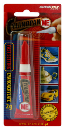 Uniwersalny klej błyskawiczny CYJANOPAN ME 2g Cyjanopan ME jest jednoskładnikowym, bezrozpuszczalnikowym klejem cyjanoakrylowym o bardzo szybkim działaniu. Utwardzanie się spoiny polega na gwałtownej polimeryzacji pod wpływem wilgoci obecnej na łączonych elementach. Klejami serii Cyjanopan ME można łączyć: metale, gumę, szkło, ceramikę, drewno (gatunki o powierzchni zasadowej) oraz tworzywa sztuczne (za wyjątkiem PE, PP, PTFE i silikonów). Opakowanie: tuba 2g