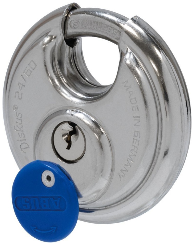 ABUS 05584. Σχέδιο προϊόντος: Λουκέτο σε σχήμα δίσκου, Μοντέλο: Κλειδαριά, Τύπος κλειδιού: Κλειδί παρόμοιο. Πλάτος: 6 cm, Βάθος: 2,6 cm, Ύψος: 6 cm. Τύπος συσκευασίας: Κουτί. Χώρα προέλευσης: Γερμανία. Ποσότητα ανά συσκευασία: 1 τεμ., Αριθμός κλειδιών που περιλαμβάνονται: 2 τεμ.