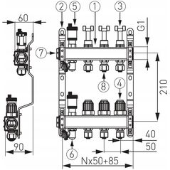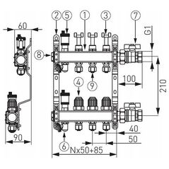 Διανομέας ορείχαλκου Kisan 1" για επιφανειακή και καλοριφέρ θέρμανση 8-κυκλικός με έξοδο για συνδέσεις G3/4" Eurokonus (KRPT 08.20.12)