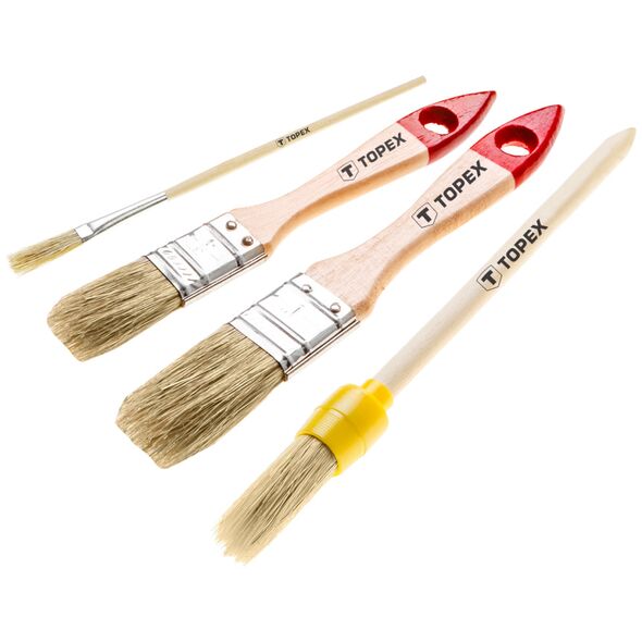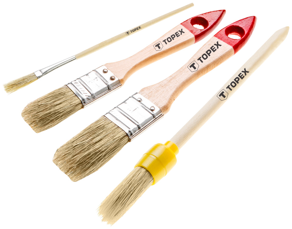 Το σετ βουρτσών TOPEX περιλαμβάνει 4 βούρτσες, συμπεριλαμβανομένων 2 επίπεδων βουρτσών σε μεγέθη 1" και 1,5", οβάλ βούρτσες αρ