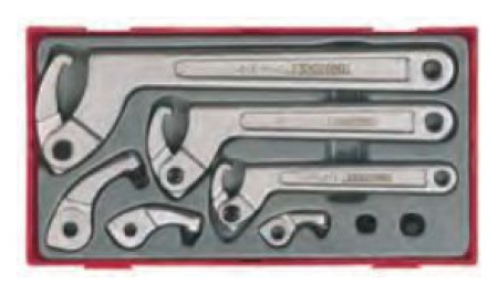 Σετ που αποτελείται από: 3 κλειδιά αγκίστριας γενικής χρήσης με σταθερό άγκιστρο, 3 βραχίονες για αντικαταστάσιμους γάντζους και 2 χαλαρούς γάντζους με διάμετρο 6 και 8 mm. Παρέχεται σε πλαστικό δοχείο με αποσπώμενο καπάκι. Ταιριάζει σε κιβώτια εργαλείων και καρότσια Teng Tools.