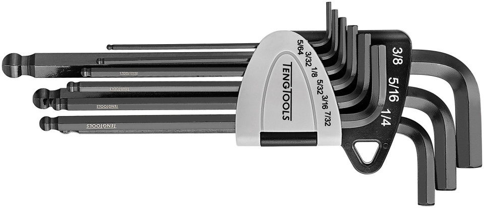 9-częściowy zestaw kluczy imbusowych. Klucze sześciokątne mają główkę kulistą na długim końcu klucza sześciokątnego, umożliwiającą dostęp pod kątem 30° i są dostarczane w składanym plastikowym uchwycie. Wykonane ze stali chromowo-molibdenowej dla zwiększenia wytrzymałości.