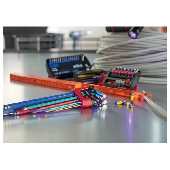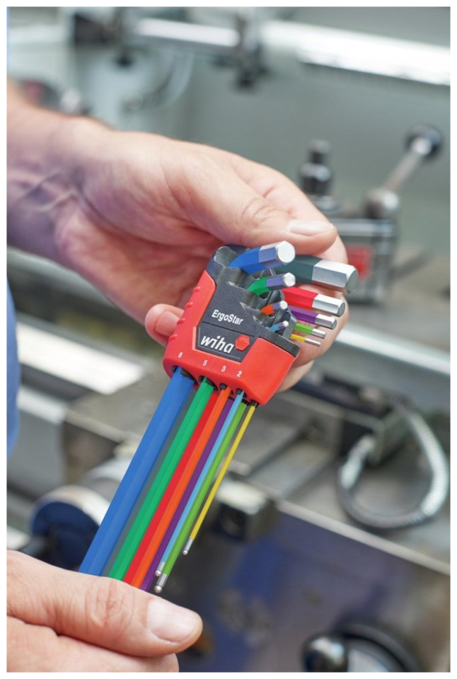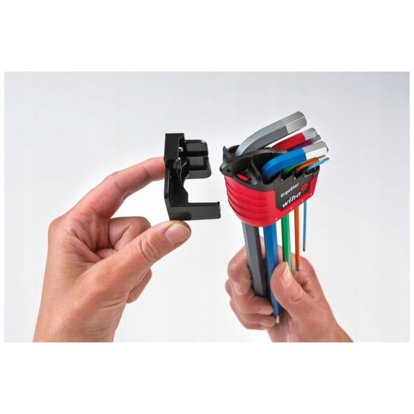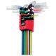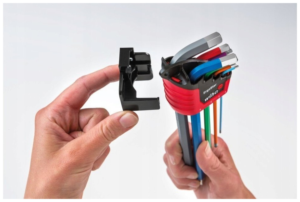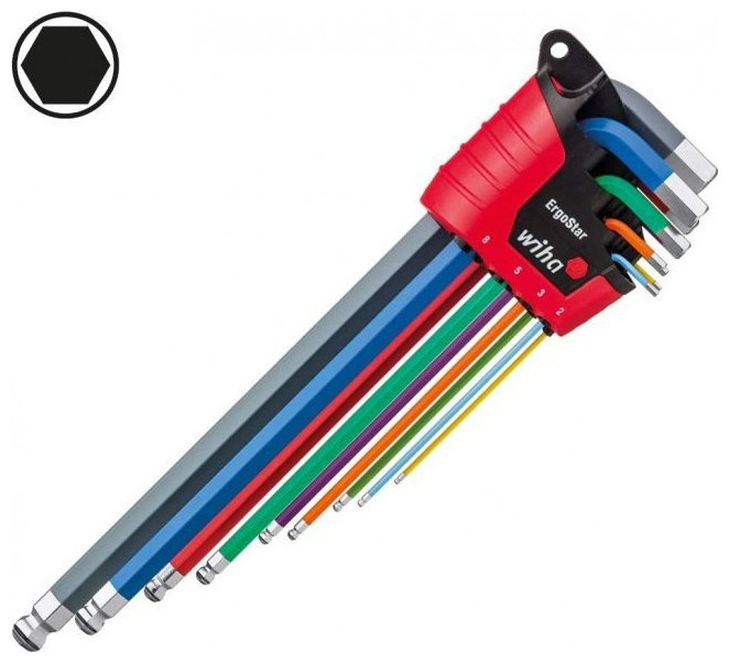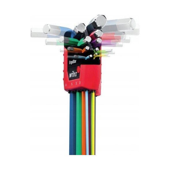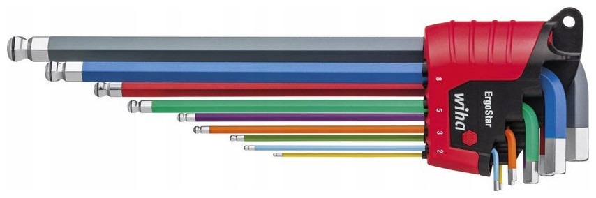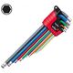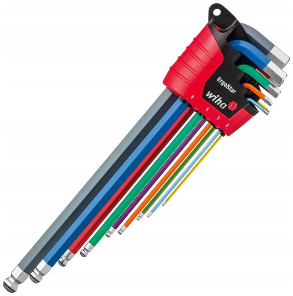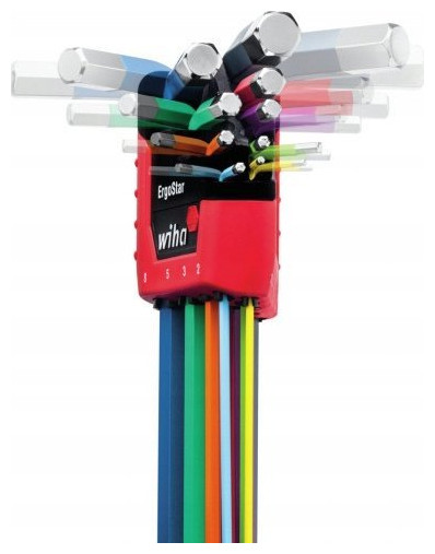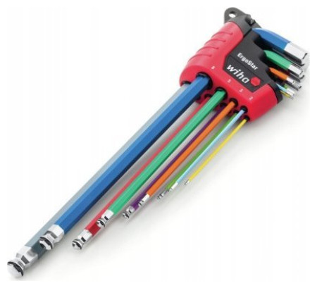 Profil: imbus wewnętrzny Długość ostrza: 91-231mm Szerokość profilu: 1.5mm/?2mm/?2.5mm/?3mm/?4mm/?5mm/?6mm/?8mm/?10mm Cechy szczególne: uchwyt z tworzywa sztucznego, głowica kulowa, funkcja mocowania (Magicpierścień), kody kolorowe Zawartość: 9 sztuk