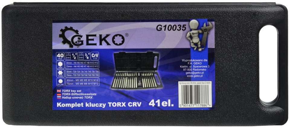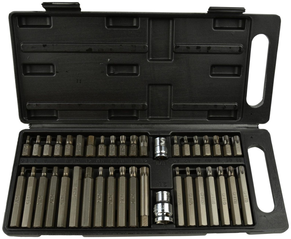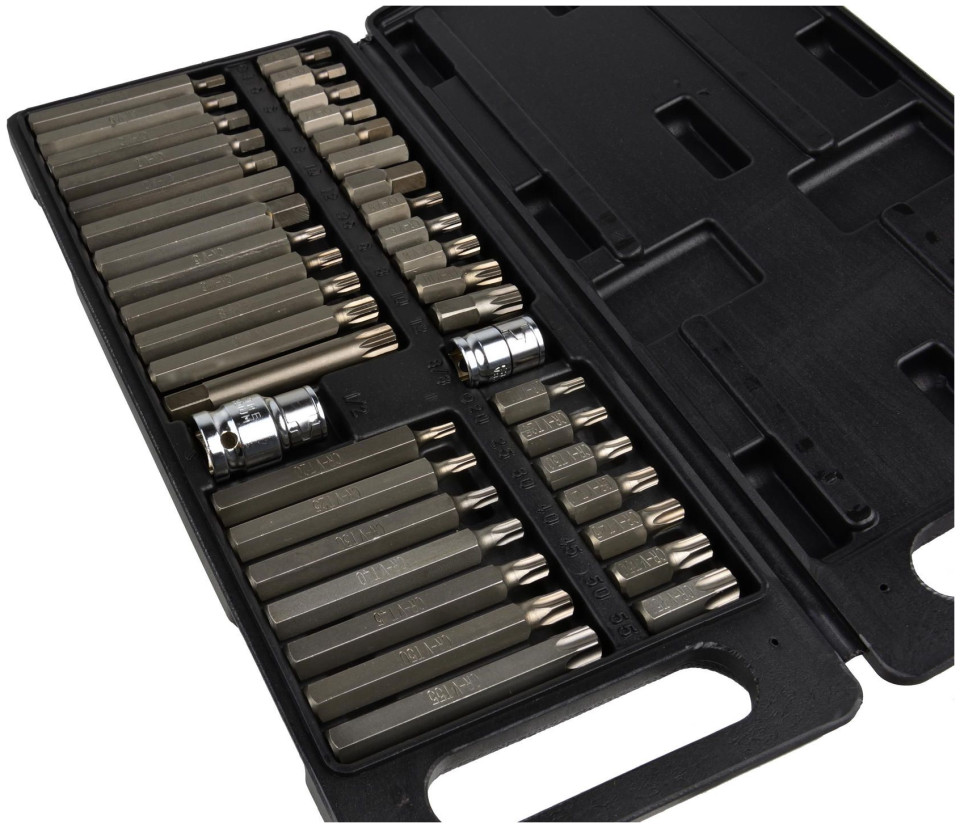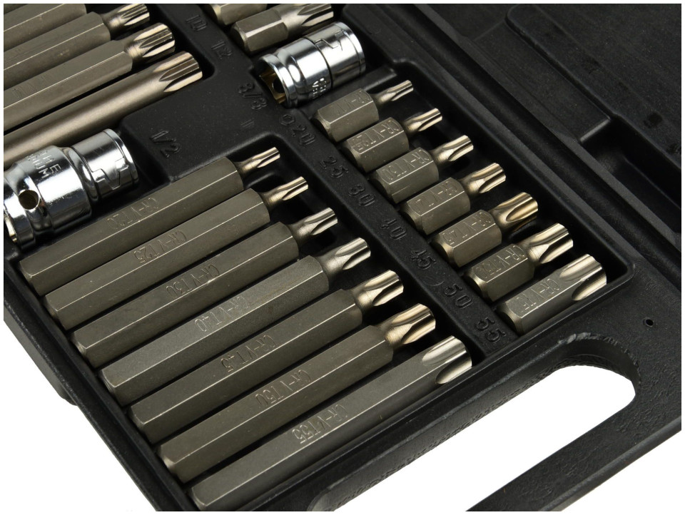 Σετ εξάγωνων πλήκτρων TORX, SPLINE, 40 στοιχείων Ένα σετ μύτες από χάλυβα CrV, που χρησιμοποιούνται για το ξεβίδωμα ειδικών βιδών όπως: torx, spline, hex. Χάρη στη μεγάλη ποικιλία κομματιών, αυτό το σετ είναι τέλειο για επαγγελματικά σέρβις και συνεργεία αυτοκινήτων. Χαρακτηριστικά προϊόντος: σετ από ατσάλι χρωμίου-βαναδίου (CrV), torx, spline και hex bits σε διάφορα μεγέθη, προσαρμογέας με υποδοχή 1/2" και 3/8" για bits 10 mm: Υποδοχή για 1/2 " bits. Υποδοχή για μπιτ TORX 3/8" 75 mm: T20, T25, T30, T40, T45, T50, T55 TORX 30 mm: T20, T25, T30, T40, T45, T50, T55 SPLINE 75 mm: M5, M6, M8, M10, M12 SPLINE 30 mm: M5, M6, M8, M10, M12 HEX bits (hex ) ) 75 mm: H4, H5, H6, H7, H8, H10, H12 HEX άκρες 30 mm: H4, H5, H6, H7, H8, H10, H12