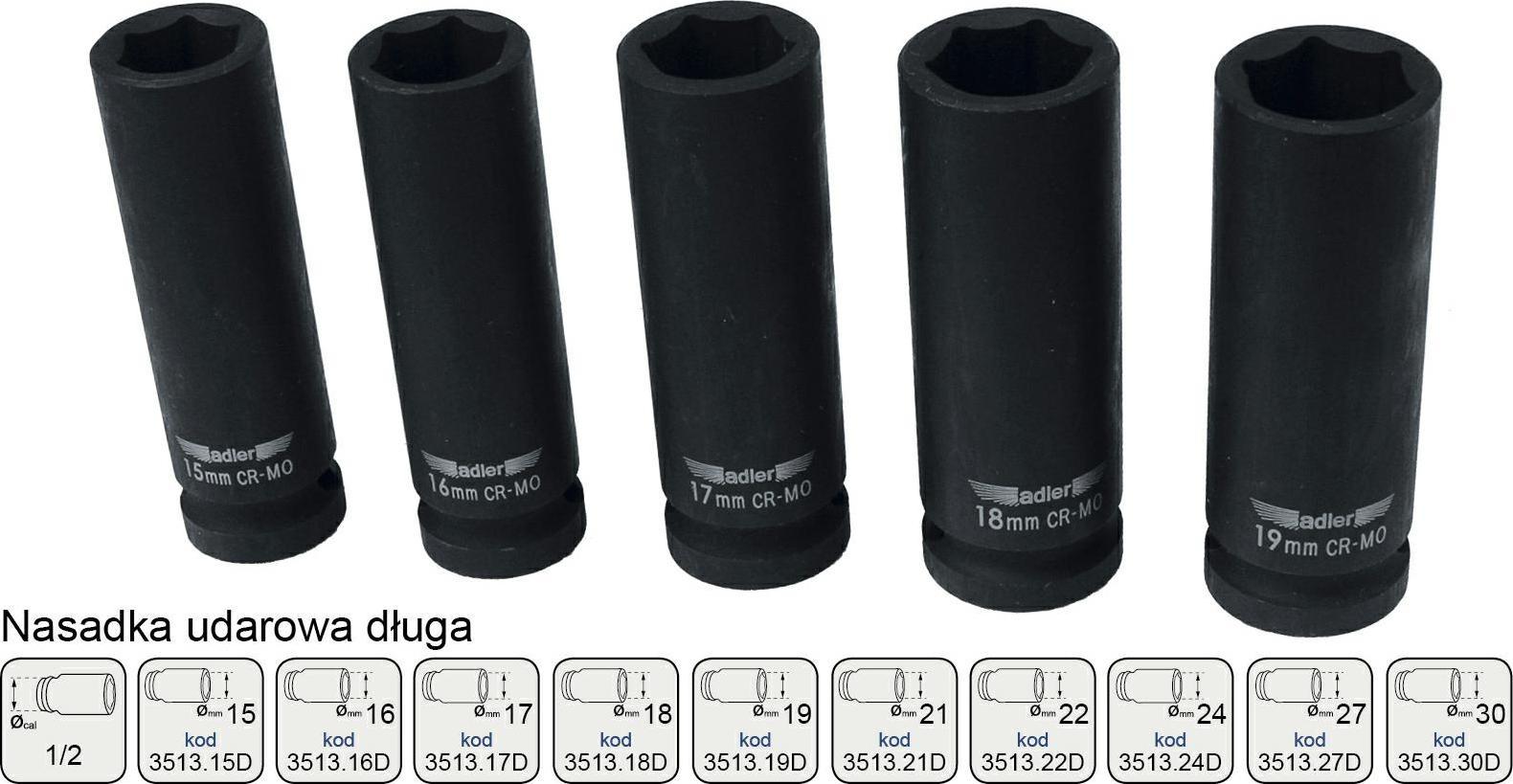 Specjalistyczne nasadki udarowe Adler, przeznaczone do współpracy z urządzeniami pneumatycznymi, które pracują w bardzo ciężkich warunkach pod zmiennymi obciążeniami. Nasadki wykonano ze stali chromowo molibdenowej (Cr-Mo). Stal Cr-Mo to unikalna stal stopowa, która posiada dwukrotnie większą wytrzymałość na rozciąganie od zwykłej stali węglowej oraz trzykrotnie wyższą granicę plastyczności. Nasadki Adler przez wydłużony czas zachowują swój nominalny wymiar oraz nie pękają pod wpływem pracy udarowej. Szczególnie polecane do profesjonalnych serwisów ogumienia oraz samochodowych.