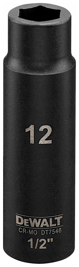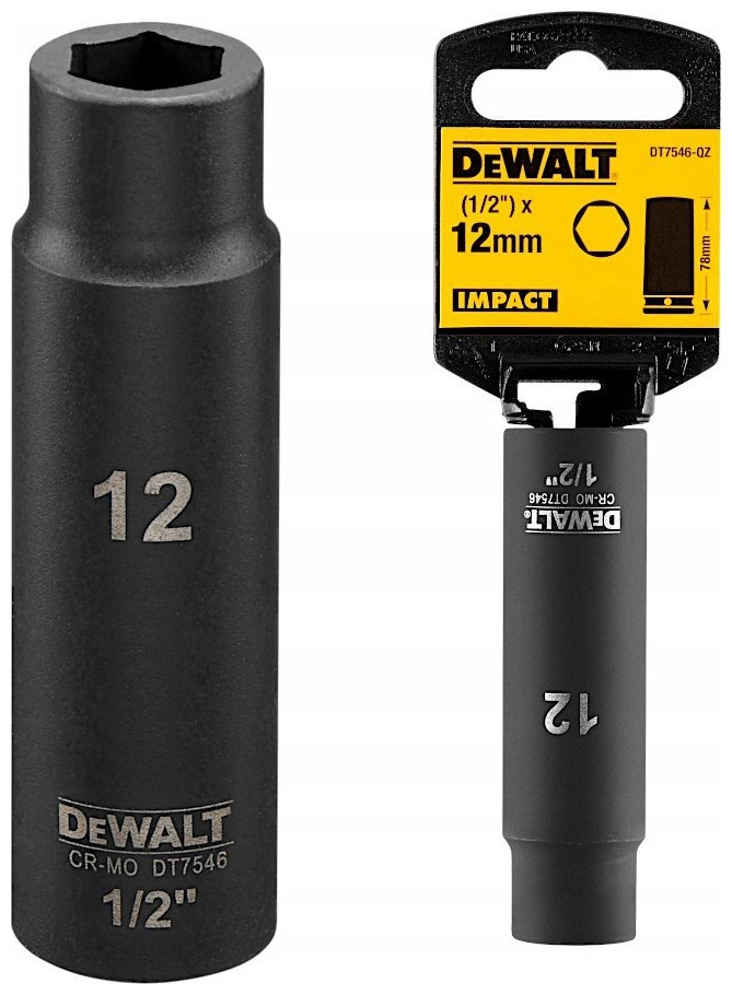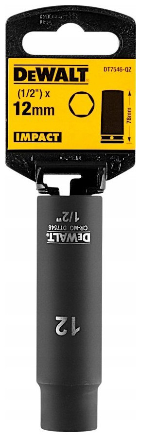 Κλειδί DEWALT DT7546 EXTREME IMPACT DEEP SOCKET WRENCH 1/2" 12mm DW-DT7546Περιγραφή EXTREME IMPACT κλειδί υποδοχής της DeWALT, 1/2", μακριά έκδοση Για κρουστικά κατσαβίδια Εξαιρετικά ανθεκτικά, δύσκολα σχεδιασμένα για τις πιο ανθεκτικές εφαρμογές. 300Nm+ Μπορεί να χρησιμοποιηθεί σε κρουστικά κατσαβίδια, τρυπάνια και κατσαβίδια (μπαταρίες, ηλεκτρικά και ελατήρια) Τεχνικά στοιχεία Διάμετρος: 12mm Μήκος: 78mm Στέλεχος: 1/2" Ποσότητα στη συσκευασία: 1 τεμ. Πρόσθετες πληροφορίες Ειδική σκλήρυνση – Εξαιρετική αντοχή και αντοχή, εξασφαλίζοντας μακροχρόνια χρήση ακόμη και στις πιο δύσκολες συνθήκες Συμμόρφωση με τα πρότυπα ISO2725-2 - Για κρουστικά κατσαβίδια που τροφοδοτούνται με ελατήριο και με καλώδιο κατσαβίδια με θήκη ή τσοκ τρυπανιού: EXTREME IMPACT κλειδί βαθιάς υποδοχής 1. /2" 12mm DeWALT DT7546.
