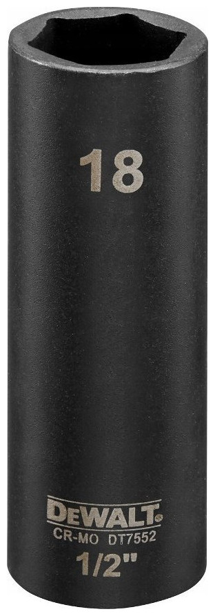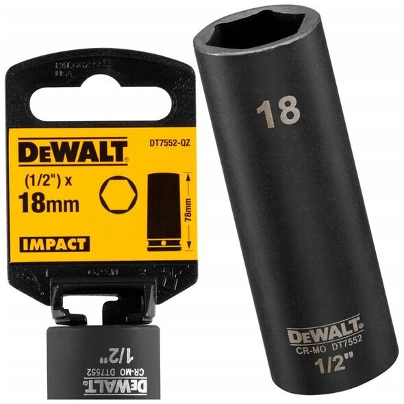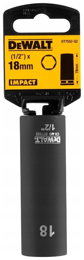 DEWALT DT7552 IMPACT SOCKET 18mm 78mm DW-DT7552 Περιγραφή προϊόντος Πολύ ανθεκτική, ανθεκτική στην κρούση υποδοχή καινοτόμου αντοχής και αντοχής, που εγγυάται μεγάλη διάρκεια ζωής ακόμη και στις πιο δύσκολες συνθήκες. Πληροί τα πρότυπα ISO2725-1 και ISO2725-2 Εφαρμογή: προορίζεται για χρήση με κρούσεις, δημιουργήθηκε για τις πιο απαιτητικές εφαρμογές έως 300 Nm+ Μπορεί να χρησιμοποιηθεί σε κρουστικά κατσαβίδια πεπιεσμένου αέρα, με μπαταρία ή με καλώδιο. Μπορούν επίσης να χρησιμοποιηθούν σε άλλα κατσαβίδια με θήκη ή τσοκ τρυπανιού Τεχνικά στοιχεία Διάμετρος: 18mm Μήκος: 78mm Τσοκ: 1/2" Περιλαμβάνεται υποδοχή κρουστικής Dewalt DT7552