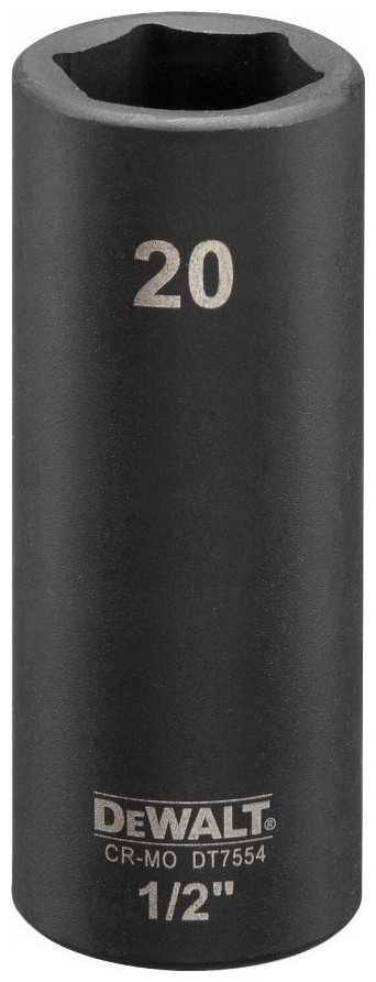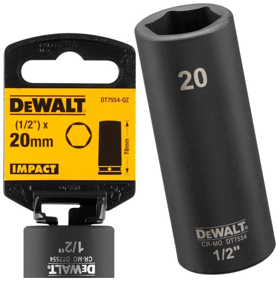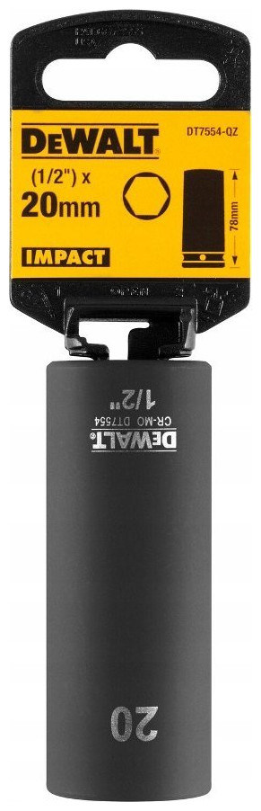 DEWALT DT7554 IMPACT SOCKET 20mm 78mm DW-DT7554Νέα Περιγραφή Φιλική προς το χρήστη σχεδιασμός Εξαιρετική αντοχή και αξιοπιστία στις πιο δύσκολες συνθήκες. Πληροί τα πρότυπα ISO2725-1 και ISO2725-2 Εφαρμογές: ιδανικό για κρουστικές εφαρμογές, σχεδιασμένο για τις πιο απαιτητικές εφαρμογές έως 300 Nm+ Χρησιμοποιείται σε πεπιεσμένο αέρα, σε λειτουργία με μπαταρία και σε κρουστικά μηχανήματα με καλώδιο. Μπορούν επίσης να χρησιμοποιηθούν σε άλλα κατσαβίδια με θήκη ή τσοκ τρυπανιού Τεχνικά στοιχεία Διάμετρος: 20mm Μήκος: 78mm Τσοκ: 1/2" Περιλαμβάνεται κρουστική υποδοχή Dewalt DT7554