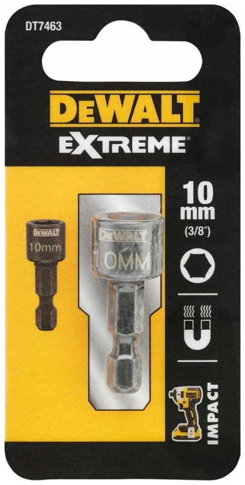 Μαγνητική υποδοχή κρουστικής 10mm DEWALT DT7463Επαγγελματική μύτη υποδοχής 10mm με μαγνήτη DEWALT 6 σημείων, μαγνητική υποδοχή για βίδες 10mm και παξιμάδια με στέλεχος 1/4''. Διαθέτει ισχυρό μαγνήτη που συγκρατεί τη βίδα ή το παξιμάδι, εξασφαλίζοντας άνετη εργασία. Οι βέλτιστες διαστάσεις (35mm συνολικό ύψος, 14mm ύψος καπακιού) επιτρέπουν την εγκατάσταση σε στενούς χώρους. Το συνολικό ύψος συμπεριλαμβανομένης της γωνιακής κεφαλής είναι μόλις λιγότερο από 60 mm. Ένας ισχυρός μαγνήτης συγκρατεί το μπουλόνι, τη βίδα ή το παξιμάδι ακόμα και όταν σφίγγει ή ξεβιδώνει. Το ειδικό προφίλ της μύτης υποδοχής προστατεύει τις γωνίες της βίδας κατά το σφίξιμο και το λύσιμο. Οι μύτες υποδοχής DeWALT είναι συμβατές με διάφορα τρυπάνια και μηχανισμούς οδήγησης, τόσο ασύρματα όσο και ηλεκτρικά. Χάρη στις συμπαγείς διαστάσεις του, είναι δυνατή η τοποθέτηση στοιχείων σε πολύ στενούς χώρους. Η υποδοχή έχει ειδικό προφίλ που προστατεύει τις γωνίες της βίδας και όλη η δύναμη κατευθύνεται στην επίπεδη επιφάνεια.DT7463