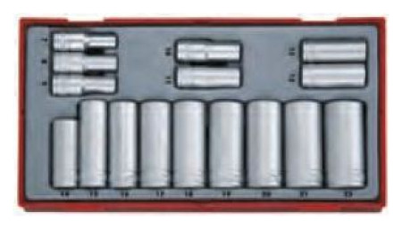 Σετ 16 μακριές υποδοχές με τετράγωνο στέλεχος 3/8". Ματ επιχρωμίωση. Παρέχεται σε πλαστικό δοχείο με αποσπώμενο καπάκι. Ταιριάζει σε κουτιά εργαλείων και καρότσια Teng Tools.