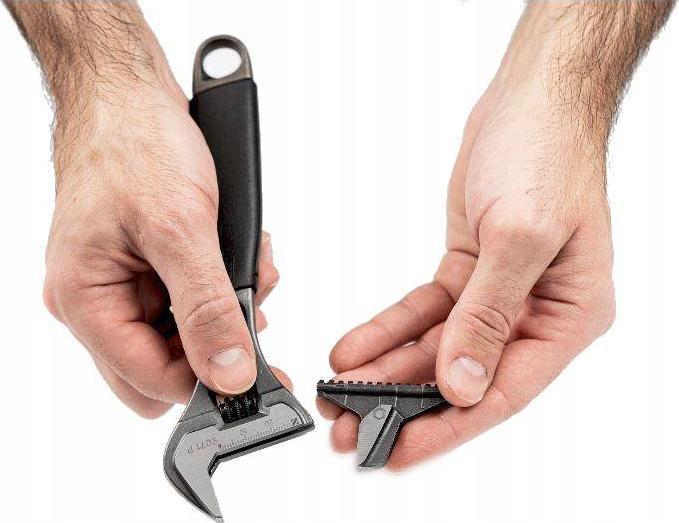 Poprzez zdjęcie i obrócenie odwracalnej szczęki, klucz regulowany może być zamieniony na klucz do rur