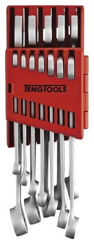 Σετ με 12 συνδυαστικά κλειδιά από χάλυβα χρωμίου βαναδίου, ίδιου μεγέθους και στα δύο άκρα. Δακτυλιοειδής κεφαλή δωδεκάγωνη, βαθύτερη, λυγισμένη υπό γωνία 15°. Ανοιχτό άκρο κατασκευασμένο στο σύστημα hip-grip, με αντιολισθητικές αυλακώσεις. Το τμήμα λαβής είναι κωνικό προς τα άκρα για βελτίωση της άνεσης συγκράτησης. Μια τρύπα στο μέρος της λαβής για να στερεώσετε το εργαλείο. Παρέχεται σε πρακτικό, αναδιπλούμενο πλαστικό πλαίσιο με μαγνήτη.