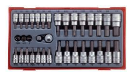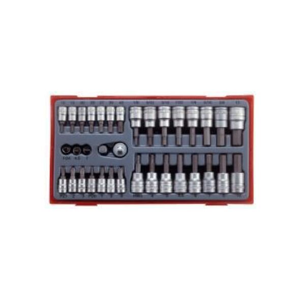 Σετ αποτελούμενο από 35 μέρη. Περιλαμβάνει: 33 υποδοχές κορμού 1/4" και 3/8", προσαρμογείς 1/4" - 3/8" και 3/8" - 1/4". Παρέχεται σε πλαστικό δοχείο με αποσπώμενο καπάκι. Ταιριάζει σε κιβώτια εργαλείων και καρότσια Teng Tools.