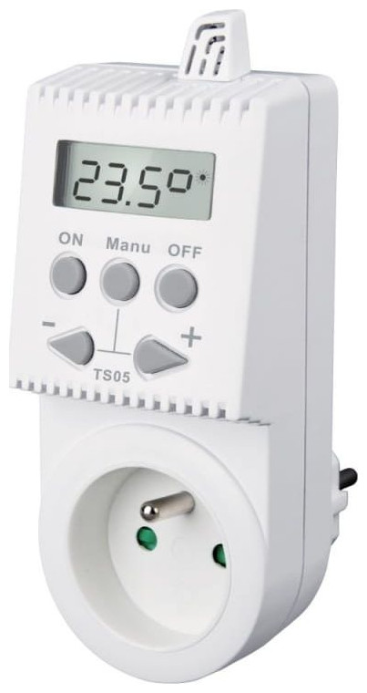Ο θερμοστάτης υποδοχής TS05 είναι μια πολύ απλή λύση για μη απαιτητικούς χρήστες. Ρυθμίστε γρήγορα την επιθυμητή θερμοκρασία χρησιμοποιώντας τα κουμπιά. Κατάλληλο για υπέρυθρες θερμάστρες, ηλεκτρικές θερμάστρες σκάλας μπάνιου κλπ. Χρησιμοποιώντας τα κουμπιά +/- μπορούμε να μειώσουμε ή να αυξήσουμε την απαιτούμενη θερμοκρασία. Αυτός ο κύκλος επαναλαμβάνεται αυτόματα Η χειροκίνητη ρύθμιση θερμοκρασίας σάς επιτρέπει να εξοικονομήσετε έως και 30% ενέργειας. Για χρήση στο σπίτι, στο γραφείο κ.λπ. Πλεονεκτήματα του ελεγκτή υποδοχής TS05: