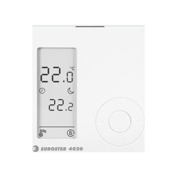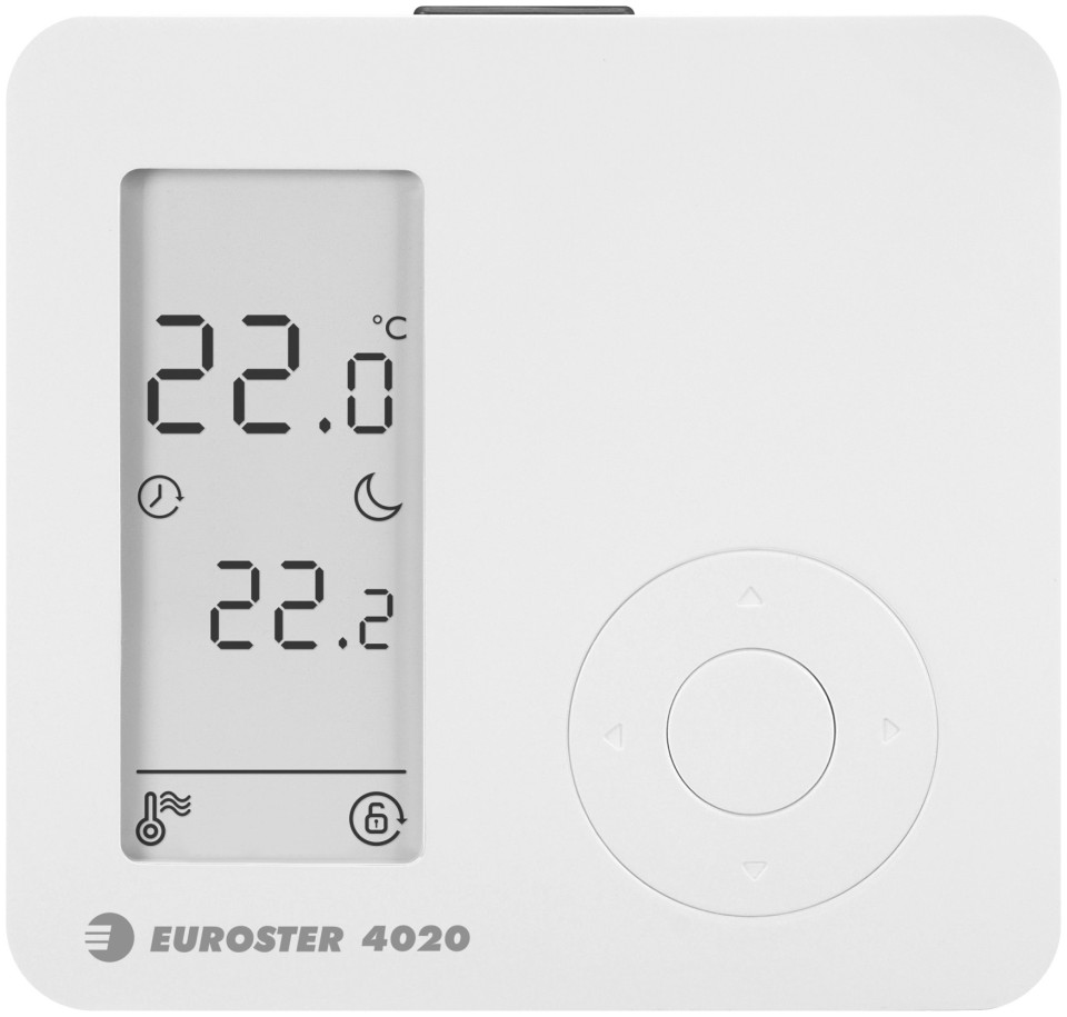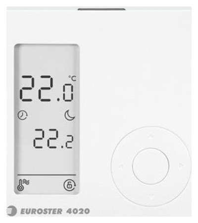 EUROSTER 4020 Euroster 4020 με μεγάλη οθόνη με οπίσθιο φωτισμό και προγραμματιζόμενη προσωρινή μείωση της θερμοκρασίας άνεσης. Χάρη στη δυνατότητα συνεργασίας με 2 αισθητήρες θερμοκρασίας και τη λειτουργία PWM, λειτουργεί βέλτιστα με συστήματα ενδοδαπέδιας θέρμανσης. Έλεγχος θερμοκρασίας όπως περιμένετε, αξιόπιστη λειτουργία και ασφάλεια - αυτά είναι τα κύρια πλεονεκτήματα του νέου ελεγκτή θερμοκρασίας Euroster 4020 Στη μεγάλη, οπίσθια φωτιζόμενη οθόνη. Ο ελεγκτής σταθεροποιεί αποτελεσματικά τη θερμοκρασία δωματίου στο επιθυμητό επίπεδο, εξασφαλίζοντας άνεση χρήστη και πραγματική εξοικονόμηση ενέργειας. Μια σειρά από χρήσιμες πρόσθετες λειτουργίες αυξάνουν την ελκυστικότητα και την ευελιξία της χρήσης του ρυθμιστή τόσο σε νοικοκυριά όσο και σε δημόσιους χώρους. Ο ρυθμιστής έχει μια λειτουργία που περιορίζει τη ρύθμιση της θερμοκρασίας από μη εξουσιοδοτημένα άτομα. Πλεονεκτήματα: εύχρηστος ελεγκτής θερμοκρασίας που επιτρέπει τον εύκολο έλεγχο της θερμοκρασίας σε σαλόνια και βοηθητικούς χώρους, που χρησιμοποιείται για τον έλεγχο της λειτουργίας του λέβητα και της αντλίας κεντρικής θέρμανσης. ή άλλη συσκευή θέρμανσης, λειτουργία προσωρινής μείωσης της ρυθμισμένης θερμοκρασίας, κλείδωμα του ελεγκτή με οποιονδήποτε 3ψήφιο κωδικό, δυνατότητα εργασίας σε έναν από τους τρεις τρόπους λειτουργίας: λειτουργία ρύθμισης θερμοκρασίας δωματίου, λειτουργία ρύθμισης θερμοκρασίας δαπέδου, λειτουργία ρύθμισης θερμοκρασίας δωματίου με δάπεδο περιορισμός θερμοκρασίας, ρύθμιση υστέρησης στην περιοχή από 0, 2°C έως 10°C ή ρύθμιση PWM, ταυτόχρονη εμφάνιση της τρέχουσας και ρυθμισμένης θερμοκρασίας στην οθόνη, ρύθμιση θερμοκρασίας και ένδειξη με ακρίβεια 0,1°C, λειτουργία απενεργοποίησης ο ρυθμιστής μετά την περίοδο θέρμανσης, σηματοδότηση αποφορτισμένων μπαταριών, διόρθωση ενδείξεων θερμοκρασίας, επιφανειακή τοποθέτηση.
