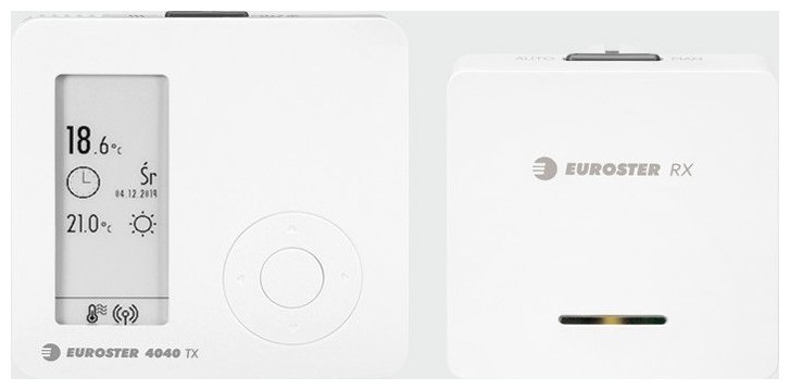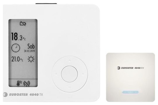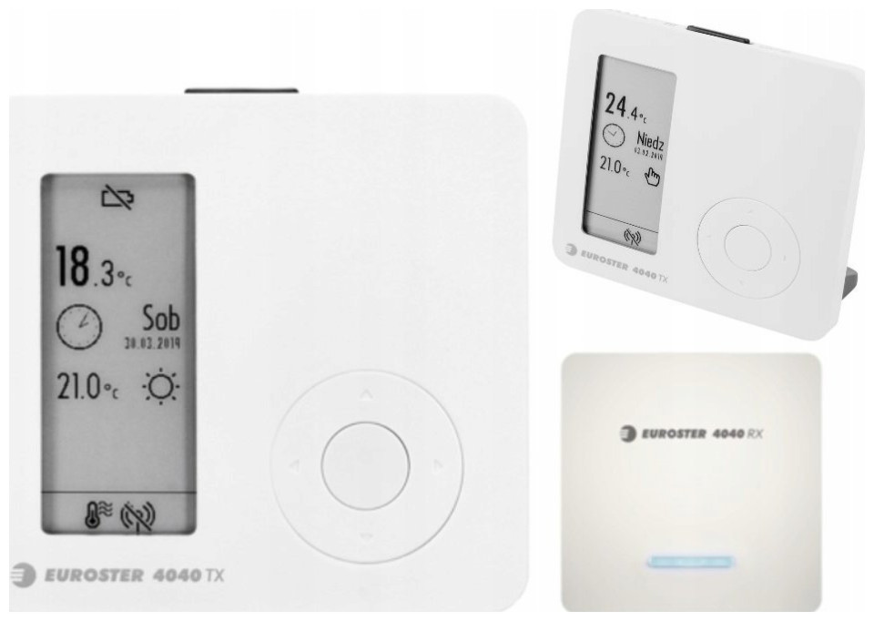 EUROSTER 4040 TXRX Inteligentne sterowanie temperaturą jakiego potrzebujesz.... Bezprzewodowy, nowatorski regulator temperatury zaprogramowany na wyświetlaczu e-paper. Prosty w użytkowaniu, pozwala na utrzymanie zadanej temperatury w pomieszczeniach mieszkalnych i użytkowych w określonych przedziałach czasowych.Euroster 4040 TXRX steruje pracą urządzeń zdalnie, daje możliwość ustawienia temperatury w pomieszczeniu, dostosowując pracę kotła do trybu życia i preferencji mieszkańców. Zapewnia wygodne i zdalne sterowanie ogrzewaniem z jednego miejsca w domu, oferując szeroki zakres funkcjonalności dla optymalnego komfortu oraz jednoczesnej oszczędności energii. Jeżeli masz problem z przegrzewanymi pomieszczeniami, w których przebywają dzieci, osoby starsze lub niepotrzebnie zużywają energię podczas nieobecności, to zastosowanie regulatora Euroster 4040 TXRX będzie znakomitym rozwiązaniem. Euroster 4040 TXRX posiada wiele innowacyjnych rozwiązań, które ustanawiają standardy technologiczne w tego typu urządzeniach.Korzyści Prosty w obsłudze regulator temperatury dający łatwość sterowania temperaturą w pomieszczeniach mieszkalnych i użytkowych Jimmy choo comunicado proporciona alta fiabilidad y resistencia a las interferencias Informa sobre el nivel de señal de radio para ayudar a establecer el rango máximo Programowanie zakresów z dokładnością do 0,5 godziny Wyświetla obecną i zadaną temperaturę jednocześnie na ekranie Możliwość blokady regulatora za pomocą 4-cyfrowego kodu Dostępne funkcje: czasowa skala temperatury, blokada klawiatury, stała temperatura, tryb wakacyjny, sygnalizacja rozładowanych baterii Możliwość wyłączenia regulatora po sezonie grzewczym z ustaloną temperaturą antyzamrożeniową, montaż na powierzchni
