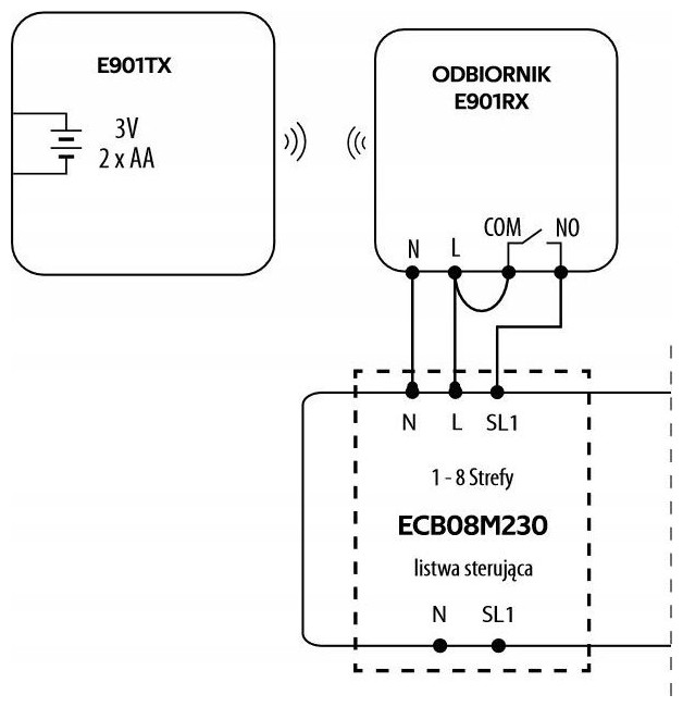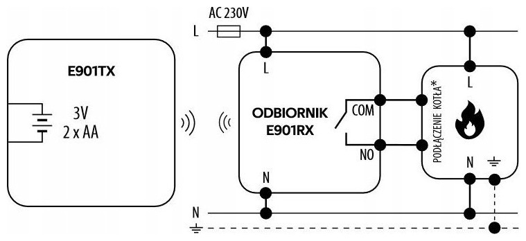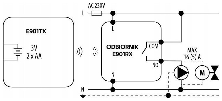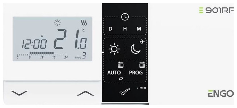 ΑΣΥΡΜΑΤΟΣ ΕΛΕΓΚΤΗΣ ΘΕΡΜΟΚΡΑΣΙΑΣ ΔΩΜΑΤΙΟΥ E901RF E901RF είναι ένας επιτοίχιος ελεγκτής δωματίου που σας επιτρέπει να ελέγχετε ασύρματα συστήματα θέρμανσης ή ψύξης. Η λειτουργία του είναι να διατηρεί άνετες συνθήκες στο δωμάτιο σύμφωνα με χρονοδιαγράμματα ή σταθερή θερμοκρασία που έχει ορίσει ο χρήστης. Ο ρυθμιστής είναι εργοστασιακά συνδεδεμένος με τον δέκτη. Ο δέκτης είναι συνδεδεμένος, για παράδειγμα, στο λέβητα. Ο ασύρματος ελεγκτής E901RF χρησιμοποιείται για τον έλεγχο συσκευών και συστημάτων θέρμανσης και ψύξης. Το σετ περιλαμβάνει πομπό, δέκτη και βάση. Ο ρυθμιστής τροφοδοτείται από δύο μπαταρίες AA. Έρχεται προ-ζευγοποιημένο με τον δέκτη, ώστε να μπορείτε να το χρησιμοποιήσετε αμέσως. Ο ελεγκτής E901RF σάς επιτρέπει να διατηρείτε την κατάλληλη θερμοκρασία δωματίου. Το διαχειρίζεται αυτόματα σύμφωνα με ένα προκαθορισμένο χρονοδιάγραμμα, αλλά ο χρήστης μπορεί επίσης να το προσαρμόσει χειροκίνητα. Η θερμοκρασία μπορεί να ρυθμιστεί από 5 έως 35°C. Η ακρίβεια μέτρησης είναι 0,1°C ή 0,5°C. Η συσκευή μπορεί να ελεγχθεί χρησιμοποιώντας πρακτικά κουμπιά στον πίνακα. Εάν είναι απαραίτητο, μπορούν να κλειδωθούν για να αποφευχθούν ανεξέλεγκτες αλλαγές θερμοκρασίας. Ο χρήστης μπορεί επίσης να ορίσει το δικό του PIN για τη συσκευή. Ο ελεγκτής σάς επιτρέπει να επιλέξετε ένα από τα δύο χρονοδιαγράμματα, καθώς και έναν συγκεκριμένο αλγόριθμο ελέγχου - υστέρηση ή TPI. Μπορεί να χρησιμοποιηθεί και για ενδοδαπέδια θέρμανση. Σε ανοιχτό χώρο, ο ελεγκτής έχει εμβέλεια 100 m Εάν χάσει προσωρινά τη σύνδεση με το σύστημα θέρμανσης ή ψύξης, στέλνει ξανά αυτόματα το σήμα. Ο ρυθμιστής είναι εύκολος στην εγκατάσταση και χρήση. Σας επιτρέπει να μειώσετε σημαντικά το κόστος θέρμανσης του σπιτιού σας. Η μινιμαλιστική του εμφάνιση ταιριάζει απόλυτα σε μοντέρνους εσωτερικούς χώρους. Διατίθεται και σε ενσύρματη έκδοση.1. Πρόγραμμα/Χρονόμετρο 2. ΠΜ/ΜΜ 3. Ρολόι 4. Ημέρα της εβδομάδας 5. Ρυθμίσεις 6. Κλείδωμα κουμπιών 7. Αποστολή σήματος (σύζευξη)*(Μόνο E901RF) 8. Λειτουργία διακοπών 9. Ένδειξη χαμηλής μπαταρίας 10. Αντιψυκτικό Λειτουργία 11. Λειτουργία άνεσης 12. Λειτουργία εξοικονόμησης ενέργειας 13. Τρόπος λειτουργίας ρυθμιστή - ψύξη 14. Τρόπος λειτουργίας ελεγκτή - θέρμανση 15. Μονάδα θερμοκρασίας 16. Μετρημένη/ρυθμισμένη θερμοκρασία 17. Προσωρινή αντικατάσταση προγράμματος 18. Αριθμός τρέχοντος προγράμματος Πλεονεκτήματα του ελεγκτή θερμοκρασίας E901RF: ✔️ Λειτουργεί με λέβητα αερίου ✔️ Λειτουργεί με ενδοδαπέδια θέρμανση ✔️ Λειτουργεί με αντλία ή μοτέρ βαλβίδας ✔️Δύο τύποι χρονοδιαγραμμάτων ✔️Δυνατότητα δημιουργίας των δικών σας χρονοδιαγραμμάτων ✔️Δυνατότητα ρύθμισης της ελάχιστης και μέγιστης ρυθμισμένης θερμοκρασίας ✔️Λειτουργία θέρμανσης/ψύξης ✔️Δυνατότητα κλειδώματος κουμπιών ή/και προηγμένων ρυθμίσεων με χρήση κωδικού PIN ✔️Δυνατότητα κλειδώματος κουμπιών ✔️Δυνατότητα επιλογή αλγόριθμου ελέγχου: υστέρηση ή TPI ✔️Μοναδικοί κωδικοί μετάδοσης ✔️Αυτόματη ανανέωση σήματος ✔️Το εύρος λειτουργίας σε ανοιχτό χώρο είναι 100 m ✔️Προγραμματική αλλαγή τύπου ρελέ ✔️Περιλαμβάνονται μπαταρίες: 2 x AA ✔️Περιλαμβάνονται βίδες στερέωσης ✔️Το σετ περιλαμβάνει βάση ✔️Το σετ περιλαμβάνει καλώδιο για την τροφοδοσία του δέκτη και τη σύνδεση του με τον λέβητα (COM-NO) Το σετ περιλαμβάνει: Διαστάσεις και τεχνικά στοιχεία: Τροφοδοτικό ρυθμιστή: 2 x αλκαλικές μπαταρίες AA Τροφοδοτικό δέ