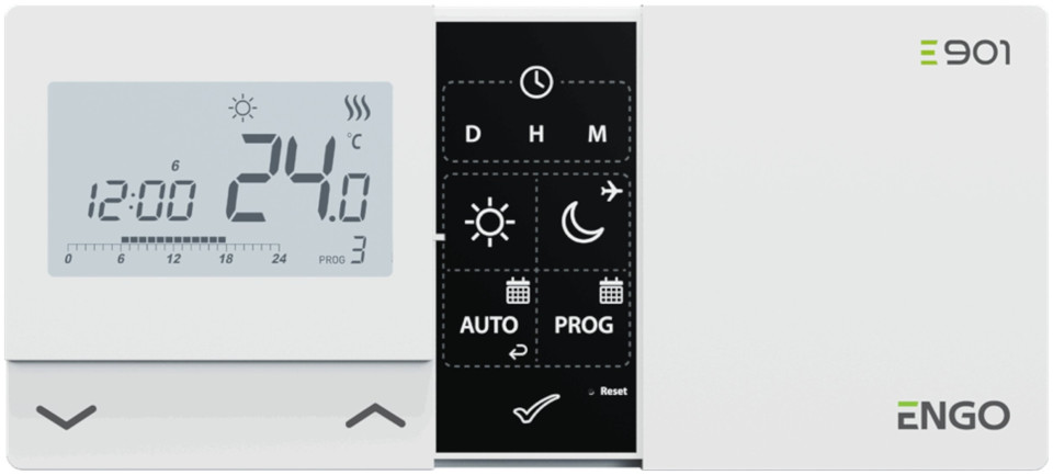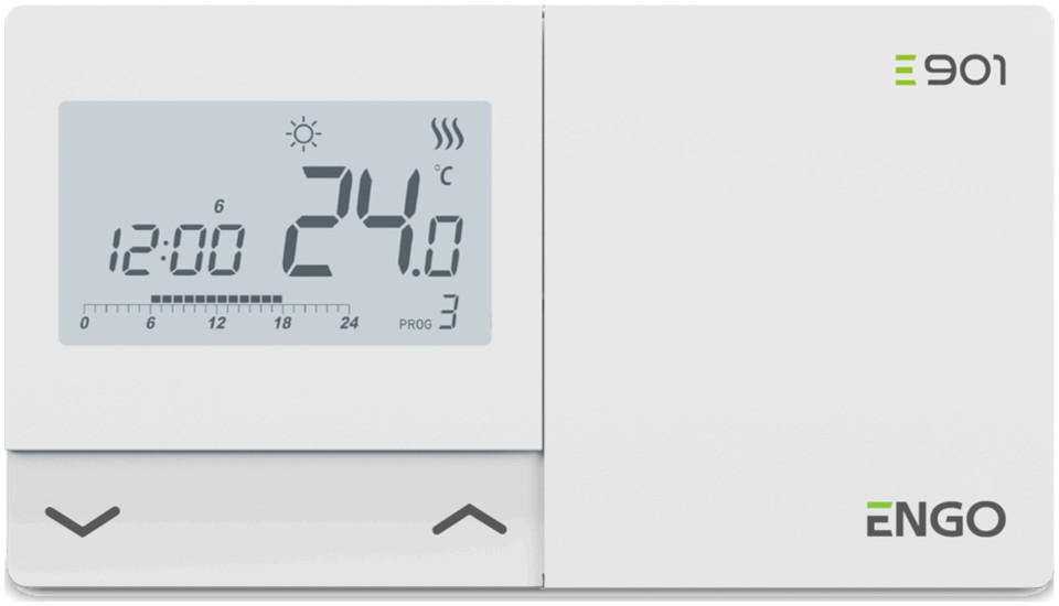 ENGO CONTROLS E901 WIRED ΕΛΕΓΚΤΗΣ ΘΕΡΜΟΚΡΑΣΙΑΣ ΔΩΜΑΤΙΟΥ ΕΒΔΟΜΑΔΙΑΙΟ ΛΕΥΚΟ ΡΥΘΜΙΣΤΗΡΑΣ E901 Προγραμματιζόμενος, ενσύρματος ελεγκτής θερμοκρασίας ✔️ Ο E901 είναι ένας ενσύρματος ελεγκτής δωματίου που χρησιμοποιείται για τον έλεγχο συσκευών θέρμανσης ή ψύξης σε συστήματα HVAC. Το καθήκον του είναι να διατηρεί ευχάριστες συνθήκες στο δωμάτιο, σύμφωνα με το πρόγραμμα εργασίας ή τη θερμοκρασία που έχει ορίσει ο χρήστης. Συνδέεται απευθείας στη συσκευή θέρμανσης. ✔️ Το E901 είναι ένας ελεγκτής θερμοκρασίας που προορίζεται για χρήση σε συστήματα HVAC και συσκευές θέρμανσης (π.χ. λέβητες αερίου, αντλίες θερμότητας) και συσκευές ψύξης. Σας επιτρέπει να ρυθμίζετε με ακρίβεια τη βέλτιστη θερμοκρασία στα δωμάτια και να εργάζεστε με χρονοδιάγραμμα. Απαιτεί απευθείας σύνδεση με τη συσκευή ή τον κεντρικό πίνακα. ✔️ Ο χρήστης μπορεί να επιλέξει ένα από τα δύο προγράμματα λειτουργίας του ρυθμιστή. Αυτό σας επιτρέπει να προσαρμόσετε με ακρίβεια τη θερμοκρασία στα δωμάτια στις μεμονωμένες προτιμήσεις των κατοίκων. Μπορεί να ρυθμιστεί στην περιοχή από 5 έως 35°C.✔️ Τόσο η εγκατάσταση όσο και η λειτουργία του ελεγκτή θερμοκρασίας E901 είναι πολύ απλή και διαισθητική. Τοποθετείται στον τοίχο χρησιμοποιώντας τις παρεχόμενες βίδες στερέωσης. Ο χρήστης μπορεί να επιλέξει λειτουργία άνεσης ή οικονομίας. Η πρώτη λειτουργία διατηρεί μια ευχάριστη θερμοκρασία κατά τη διάρκεια της ημέρας μέχρι την προγραμματισμένη ώρα ή τη στιγμή που ο χρήστης χαμηλώνει χειροκίνητα τη θερμοκρασία. Η λειτουργία οικονομικής λειτουργίας σάς επιτρέπει να μειώνετε τη θερμοκρασία τη νύχτα. Αυτό σας επιτρέπει να μειώσετε το κόστος θέρμανσης διατηρώντας παράλληλα τη βέλτιστη θερμική άνεση. ✔️ Ο ενσύρματος ελεγκτής θερμοκρασίας E901 σάς επιτρέπει να κλειδώνετε τα κλειδιά χρησιμοποιώντας έναν κωδικό PIN. Αυτή η προστασία μπορεί επίσης να χρησιμοποιηθεί για την προστασία σύνθετων ρυθμίσεων. ✔️ Η συσκευή σάς επιτρέπει να επιλέξετε τον αλγόριθμο ελέγχου θερμοκρασίας: υστέρηση ή TPI. Μπορεί επίσης να χρησιμοποιηθεί για τον αποτελεσματικό έλεγχο της ενδοδαπέδιας θέρμανσης Χαρακτηριστικά προϊόντος: ✔️ 2 τύποι χρονοδιαγραμμάτων ✔️ Δυνατότητα επιλογής αλγόριθμου ελέγχου: υστέρηση ή TPI ✔️ Δυνατότητα ρύθμισης της ελάχιστης και μέγιστης ρυθμισμένης θερμοκρασίας ✔️ Προγραμματιζόμενη αλλαγή τύπου ρελέ ✔️ ΘΕΡΜΑΝΣΗ/. Λειτουργία ΨΥΞΗΣ ✔️ Δυνατότητα μπλοκαρίσματος πλήκτρα ή/και προηγμένες ρυθμίσεις μέσω κωδικού PIN ✔️ Δυνατότητα κλειδώματος των κλειδιών ✔️ Για ρύθμιση ενδοδαπέδιας θέρμανσης ή έλεγχο πηγής θερμότητας