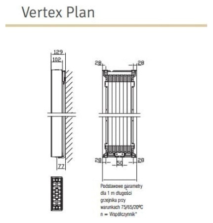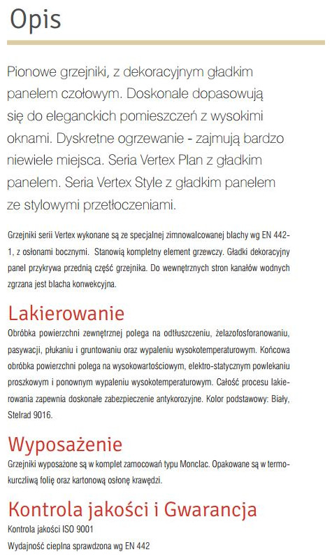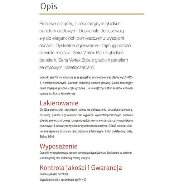Niskotemperaturowy grzejnik pionowy Vertex Plan wykonany jest z zimnowalcowanej blachy specjalnej zgładką płytą czołową, osłonami bocznymi oraz górną pokrywą