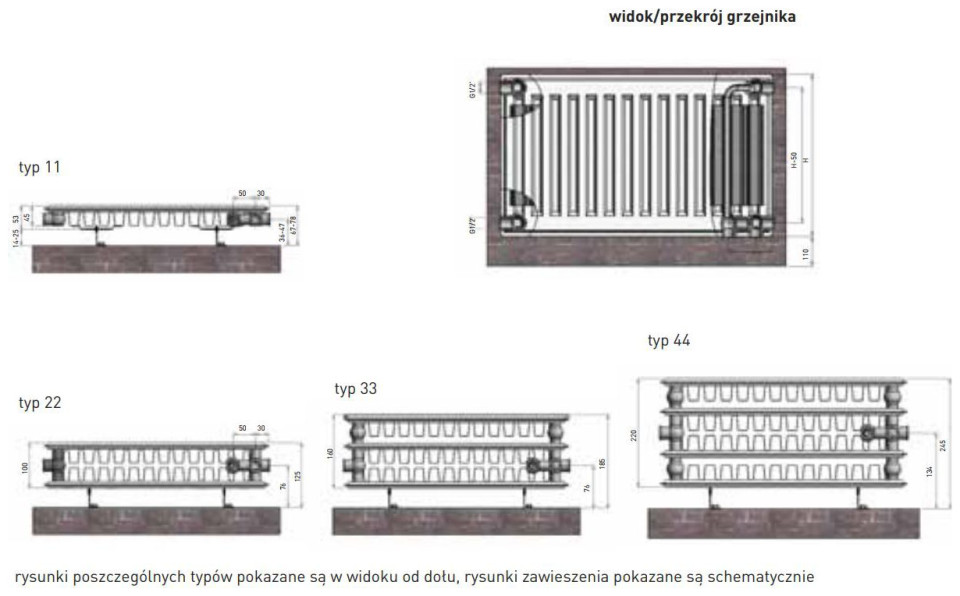 Ο τύπος 11 είναι εξοπλισμένος με ανάρτηση τύπου "L" (τυπική τροφοδοσία δεξιά, προαιρετικά αριστερά), άλλοι τύποι δεν έχουν τα λεγόμενα "αυτιά" ώστε να μπορούν να τροφοδοτούνται τόσο από τη δεξιά όσο και από την αριστερή πλευρά, εξοπλισμένα με ανάρτηση "Monclac" (δεν περιλαμβάνεται στην τιμή του ψυγείου)