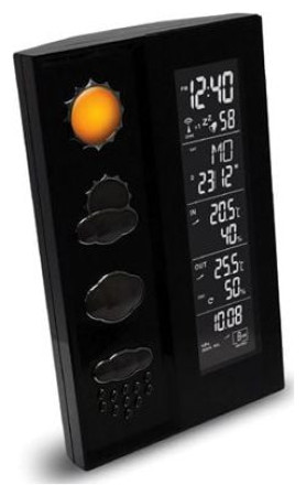 Ένας μετεωρολογικός σταθμός που προσφέρει εκτεταμένη πρόσβαση σε πληροφορίες για τον καιρό. Διαθέτει σύμβολα που σας ειδοποιούν για τις καιρικές συνθήκες που επικρατούν. Μια μεγάλη, καθαρή οθόνη διευκολύνει την ανάγνωση των ενδείξεων.{Χαρακτηριστικά} Υγρόμετρο . {Type} Μετεωρολογικός σταθμός . {Επικοινωνία} Ηλεκτρονική οθόνη . {Επικοινωνία} Ένδειξη τάσης αλλαγής πίεσης. {Λειτουργίες} Πιεσόμετρο. {Λειτουργίες} Ρολόι . {Επικοινωνία} Ένδειξη εξωτερικής θερμοκρασίας. {Functions} Σφραγίδα ημερομηνίας . {Λειτουργίες} Ξυπνητήρι . {Επικοινωνία} Ένδειξη χαμηλής μπαταρίας. {Χρώμα}Μαύρο