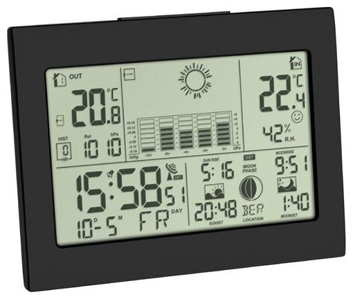 Μια ματιά στον μετεωρολογικό ραδιοφωνικό σταθμό HORIZON σας ενημερώνει αμέσως για το τρέχον κλίμα διαβίωσης και τον τοπικό καιρό. Ήλιος, σύννεφα ή σταγόνες βροχής, το ενσωματωμένο ηλεκτρονικό βαρόμετρο μετρά την πίεση του αέρα και με βάση τις αλλαγές, το σύμβολο καιρού δίνει μια πρόβλεψη για τον επερχόμενο καιρό. Το γράφημα ράβδων στην οθόνη δείχνει το ιστορικό πίεσης αέρα των τελευταίων 12 ωρών, ώστε να μπορείτε να έχετε μια πιο ακριβή εικόνα των αλλαγών του καιρού. Η εξωτερική θερμοκρασία προσδιορίζεται από ραδιοπομπό{Χαρακτηριστικά} Υγρόμετρο . {Type} Μετεωρολογικός σταθμός . {Εύρος θερμοκρασίας} από -20 βαθμούς C έως +60 βαθμούς C. {Επικοινωνία} Ηλεκτρονική οθόνη . {Μέτρηση εξωτερικής θερμοκρασίας} Εξωτερικός αισθητήρας. {Επικοινωνία} Ένδειξη τάσης αλλαγής πίεσης. {Λειτουργίες} Πιεσόμετρο. {Λειτουργίες} Ρολόι . {Εύρος υγρασίας} 20% έως 95% RH. {Functions} Σφραγίδα ημερομηνίας . {Χαρακτηριστικά} Ώρες ανατολής και δύσης του ήλιου και της σελήνης. {Χρώμα} Μαύρο. {Περιλαμβανόμενα αξεσουάρ} Εξωτερικός αισθητήρας. {Λειτουργίες}Εσωτερική και εξωτερική θερμοκρασία