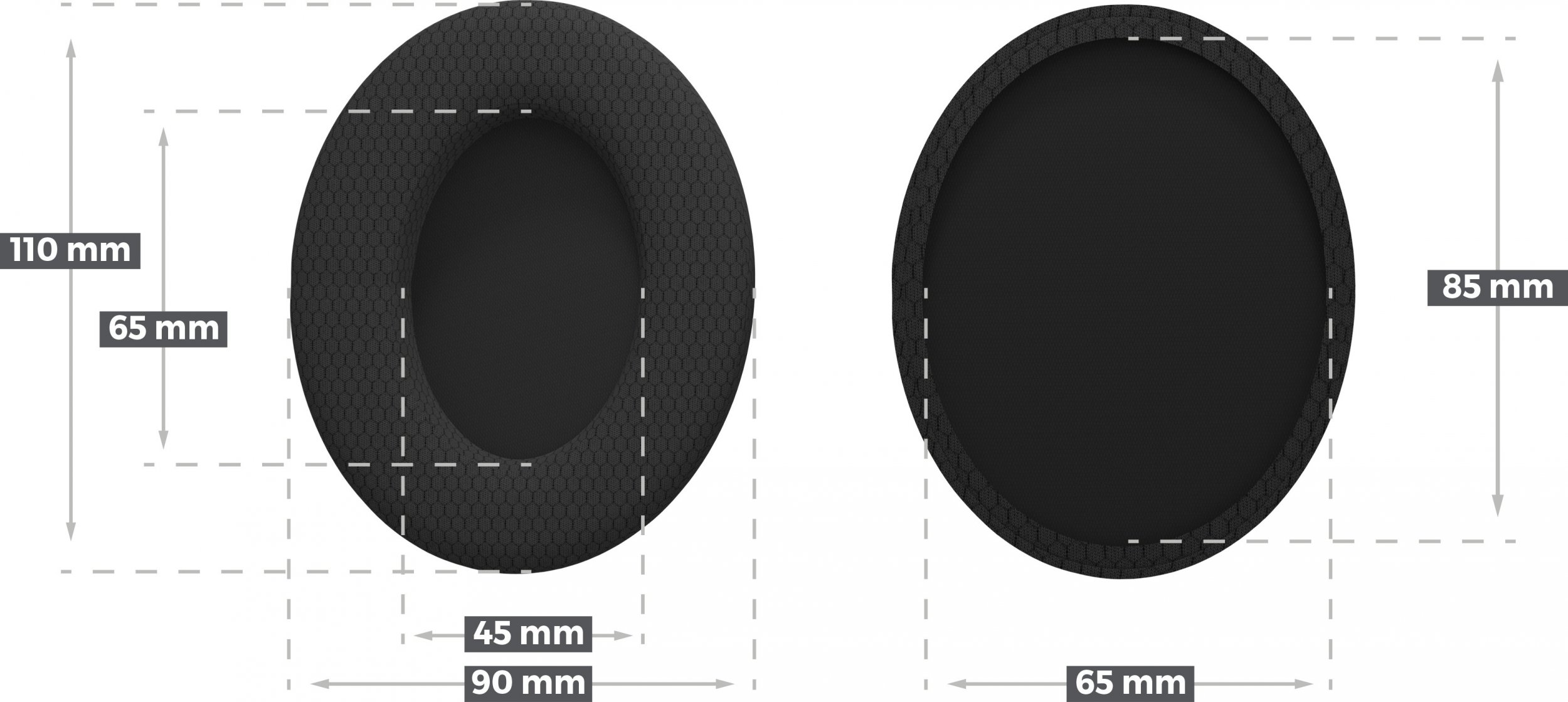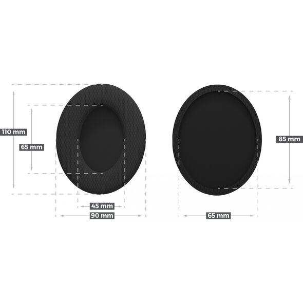 Szukasz nowych padów do słuchawek? Choć nauszniki EP02 stworzyliśmy z myślą o Genesis Toron 531 i 301, to ich montaż jest możliwy także na wielu innych słuchawkach. Wystarczy, że zmierzysz swoje stare nauszniki lub wielkość muszli i porównasz je z wymiarami przedstawionymi poniżej. Ich elastyczność sprawia, że nie musisz przejmować się milimetrowymi odchyleniami. Z łatwością dopasują się do Twojego modelu.