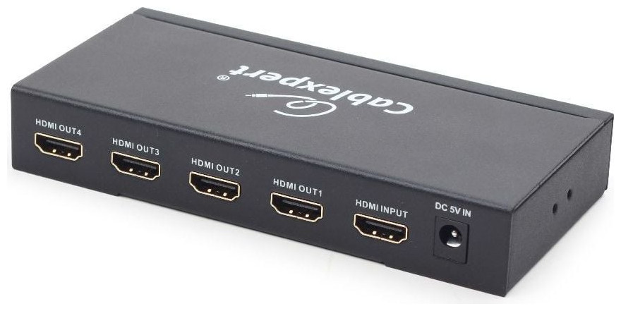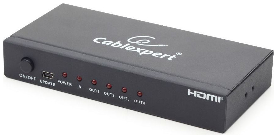 Διαχωριστής HDMI με υποδοχή εισόδου HDMI και τέσσερις εξόδους στο ίδιο πρότυπο. Οι δίοδοι LED υποδεικνύουν τη λειτουργία κάθε θύρας.