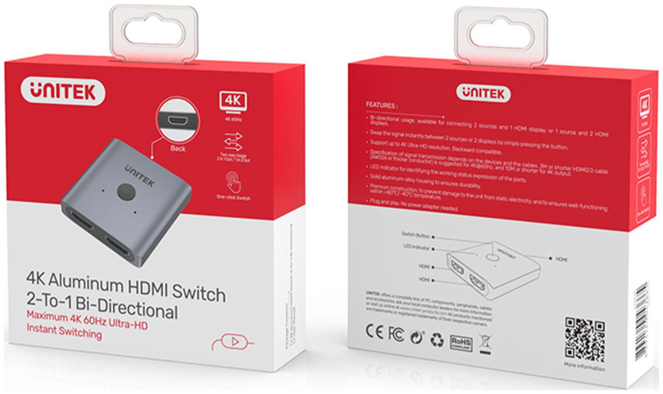 Ο αμφίδρομος διακόπτης HDMI 2.0 σάς επιτρέπει να συνδέσετε δύο πηγές σε μία οθόνη ή αντίστροφα - δύο οθόνες σε μία πηγή σήματος HDMI και να επιλέξετε εύκολα μεταξύ των δύο επιλογών χρησιμοποιώντας ένα κουμπί στο περίβλημα.