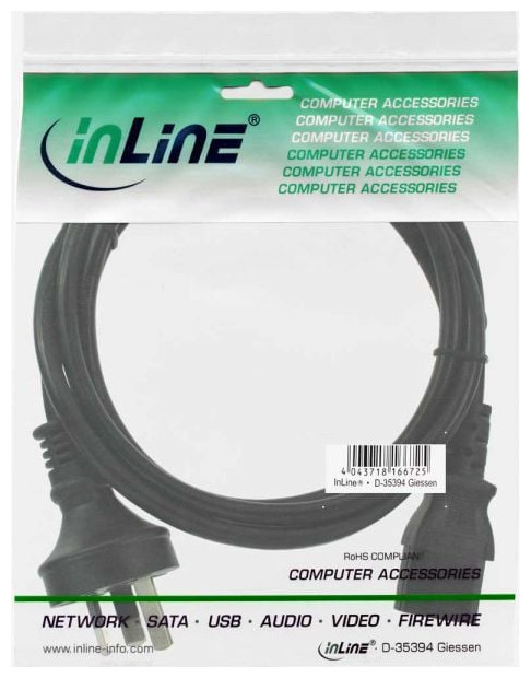 Καλώδιο τροφοδοσίας InLine Αυστραλία Αργεντινή - 3 Pin IEC C13 H05VV-F 3x0,75mm; Καλώδιο τροφοδοσίας 1,8 m της γερμανικής μάρκας InLine για σύνδεση ηλεκτρικών συσκευών με πρίζα IEC σε πρίζες Αυστραλίας ή Αργεντινής Τεχνικά στοιχεία: Μαύρο Μήκος: 1,8 m3 pin / IEC 60320 (C13){Χρώμα} Μαύρο. {Χρώμα} Μαύρο. {Μήκος καλωδίου [m]} 1,8 . {Μήκος καλωδίου [m]} 1,8