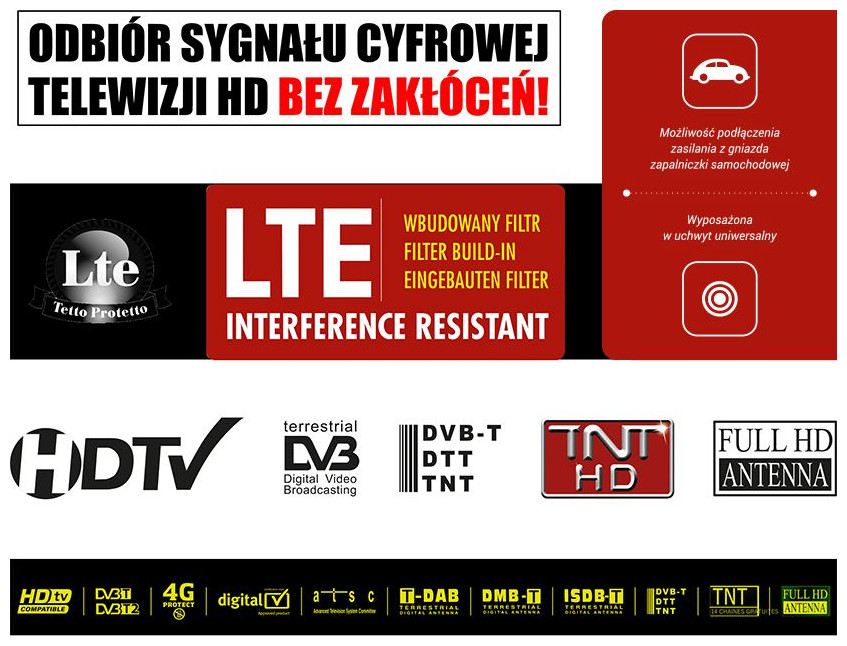 Obecność transmisji w standardzie LTE na częstotliwości 800 MHz może odbić się negatywnie na jakości sygnału DVBT poprzez zbyt silny sygnał, powodujący interferencję i zakłócający prawidłowy odbiór naziemnej telewizji cyfrowej. W takich warunkach na ekranie telewizora będą pojawiać się pojedyncze nieprawidłowe piksele, bądź zniekształcenia znacznej części obrazu, jak i dźwięku. Im silniejsze zakłócenia, tym obraz częściej stanie się „zamrożony”, bądź nawet całkowicie zniknie z ekranu odbiornika. Tego rodzaju problemy będą pojawiały się nagle, nawet przy niewielkim pogorszeniu warunków odbioru sygnału DVBT. Z zakłóceniami od sieci LTE 800 MHZ możemy w sposób dość skuteczny walczyć za pomocą tzw filtrów LTE. Taki filtr skutecznie tłumi sygnał częstotliwości od 790 MHZ do 862 MHZ, czyli pełny zakres w jakim mieści się LTE 800 MHZ. Lepszym rozwiązaniem jest zastosowanie zewnętrznych anten kierunkowych z wbudowanym filtrem LTE. Nowa seria anten BLOW wyposażona została w filtr LTE, który umożliwia eliminowanie zakłóceń sygnału naziemnej telewizji cyfrowej pochodzących od nadajników lub urządzeń wykorzystujących technologię LTE. Zapewnia to zastosowany układ SMT 4G PROTECT który skutecznie chroni przed zakłóceniami interferencyjnymi. Charakterystyka: Kompaktowa obudowa Zgrzewanie ultradźwiękowe, pełna wodoszczelność Obwód SMT,specjalnie do odbioru cyfrowej telewizji HD Nadaje się do stosowania wewnątrz lub na zewnątrz Uniwersalny uchwyt umożliwiający montaż do płaskich powierzchni Możliwość zastosowania w pojazdach Napięcie wejściowe: DC 12~24V Zakres: UKF/VHF Zakres częstotliwości: 170790 MHz Wzmocnienie UKF: 25 dB Wzmocnieni VHF: 20 dB Oporność: 75 Ohm Rotacja: 90 stopni Rozmiar: 145x70x260mm