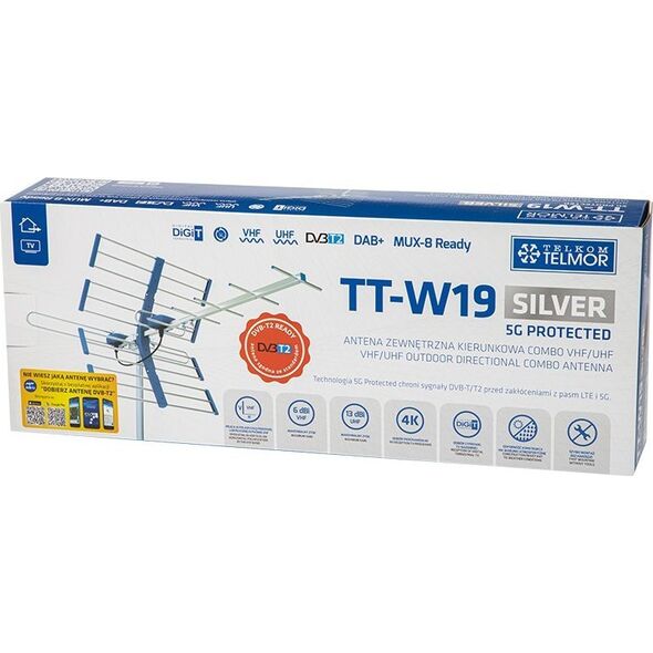 Specyfikacja:Zakres odbieranych częstotliwości (MHz): 174-230 (VHF), 470-694 (UHF)Zysk energetyczny (dBi): 13 (UHF), 6 (VHF)Polaryzacja: UHF: Pozioma (H) VHF: Pionowa (V) i Pozioma (H)Wzmocnienie przedwzmacniacza (dB): Antena pasywnaMaksymalna średnica masztu (mm): 50Wymiary (mm): 921 (długość po złożeniu)Opakowanie: KartonGwarancja: 24 miesiąceRegulowana polaryzacja dla pasma VHF umożliwia stosowanie anteny na terenie całego kraju. Antena jest wyposażona w symetryzator ze zwrotnicą UHF/VHF, dzięki czemu do budynku wprowadzony może być tylko jeden przewd antenowy. Możliwe jest rwnież podłączenie okablowania dedykowanego dla każdego z pasm, celem wzmocnienia lub regulacji poziomu w każdym paśmie niezależnie.Głwne cechy:Antena Combo: odbir UHF i VHFWysoki zysk: 13 i 6 dBiTechnologia 5G ProtectedRegulowana polaryzacja pasma VHFSzybki montaż, bez narzędziOdbir telewizji DVB-T/T2 i radia cyfrowego DAB+Konstrukcja odporna na warunki atmosferyczneDipol ze zwrotnicą UHF/VHF Zawartość zestawu: Antena TV TT W19 SILVER COMBO 5G TELMOR Cybanty montażowe Instrukcja montażu i obsługi Oryginalne opakowanie