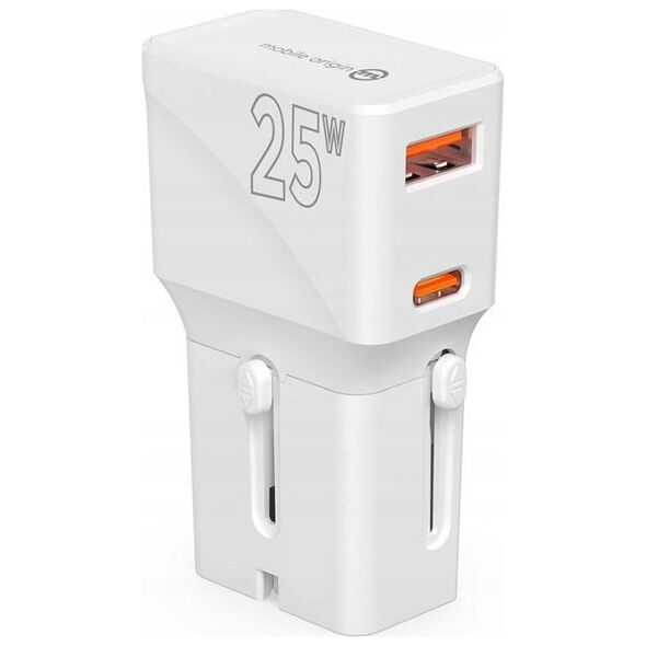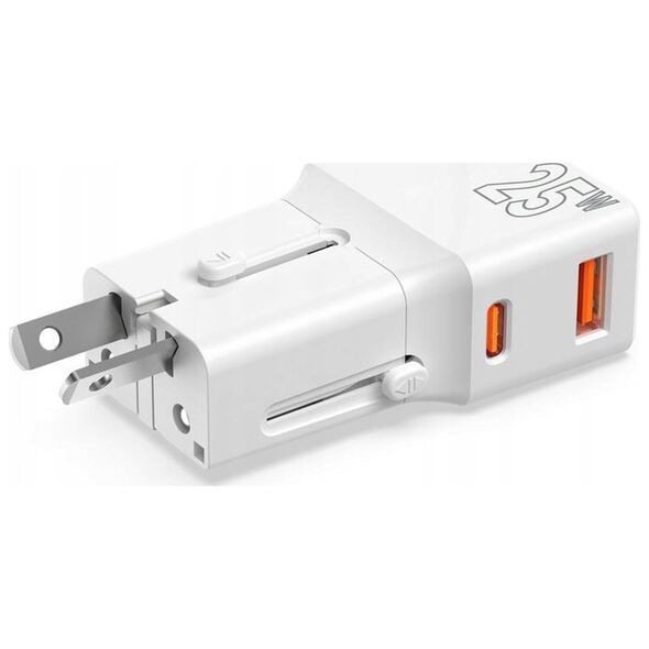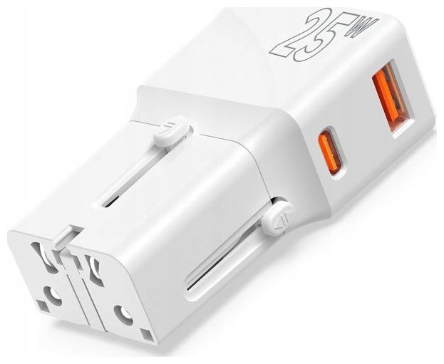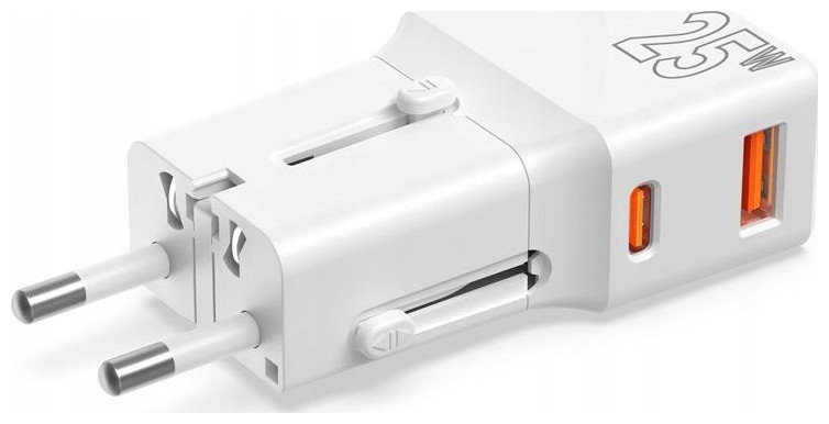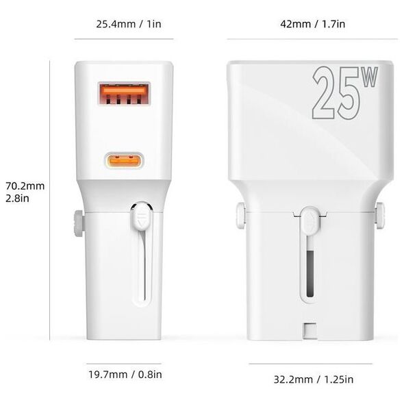 - Universal travel adapter PD+QC 25W with charger and integrated sockets to over 200 countries worldwide.Compact and Powerful: With a size 20% smaller than a bank card and dimensions of 42 × 70 × 25 mm, this adapter is perfectly compact and lightweight, easily fitting into your pocket or bag. Yet it offers incredible power - fast charging with 25W PD (Power Delivery).