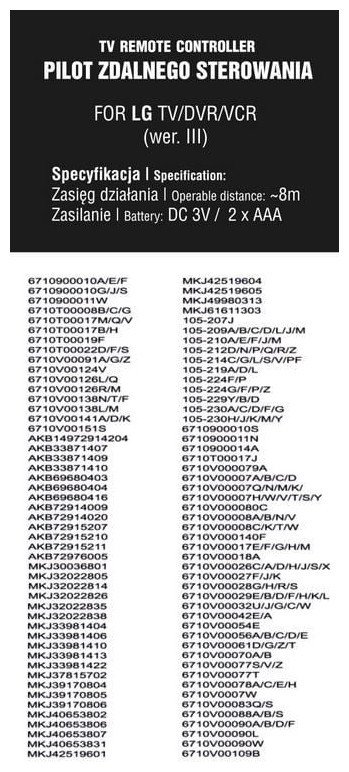 Pilot może jednocześnie sterować następującymi urządzeniami firmy LG: TV, VCR, DVR.