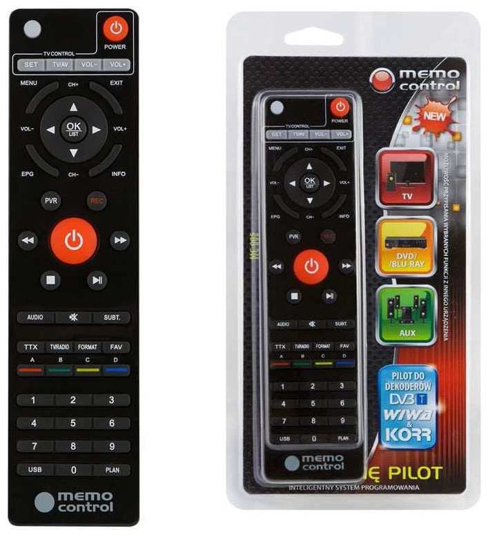 Τηλεχειριστήριο με σύστημα MEMO CONTROL (έξυπνο σύστημα προγραμματισμού) - συμβατό με οποιονδήποτε δέκτη WIWA. Αυτή η λειτουργία σάς επιτρέπει να ελέγχετε ταυτόχρονα την τηλεόραση και το δέκτη χρησιμοποιώντας ένα τηλεχειριστήριο WIWA. Το τηλεχειριστήριο διαθέτει προγραμματιζόμενα κουμπιά που μπορούν να χρησιμοποιηθούν για τον χειρισμό άλλων συσκευών που λειτουργούν στο τηλεχειριστήριο (κλιματισμός, ενισχυτής RTV, DVD, Blu-ray).{Χρώμα} Μαύρο. {Τύπος τηλεχειριστηρίου} Universal . {Οθόνη} Αρ