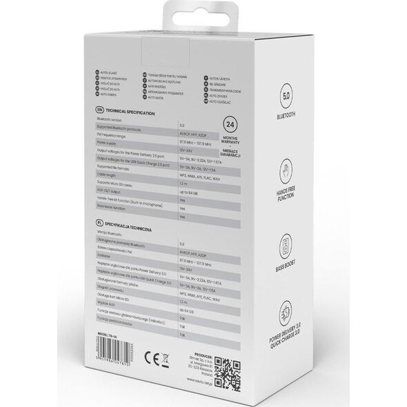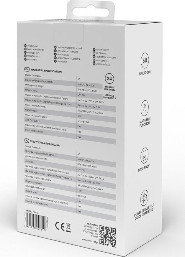Ο πομπός αυτοκινήτου TR-14 δεν έχει μόνο ασύρματες λειτουργίες, γιατί είναι εξοπλισμένος με θύρα AUX-OUT, χάρη στην οποία μπορούμε να συνδέσουμε τον πομπό με την υποδοχή AUX-IN στο αυτοκίνητό μας και να απολαμβάνουμε ποιότητα ήχου χωρίς απώλειες. Η συσκευή διαθέτει επίσης υποδοχή κάρτας Micro SD. Πληροφορίες προϊόντος