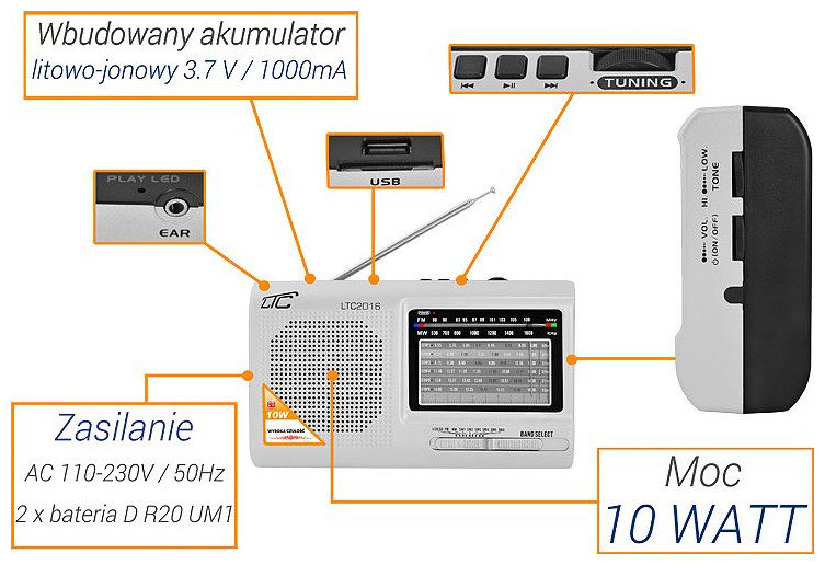 Ένα φορητό ραδιόφωνο υψηλής ποιότητας που δεν μπορεί να λείπει από το σπίτι, το εργαστήριο ή κατά τη διάρκεια ταξιδιών εκτός πόλης. Το ραδιόφωνο μπορεί να τροφοδοτηθεί είτε απευθείας από το δίκτυο 230 V, με μπαταρία με χρήση 2 μπαταριών R20 ή χωρίς πρόσθετη πηγή ενέργειας λόγω της μπαταρίας ιόντων λιθίου 1000 mA που βρίσκεται μέσα.