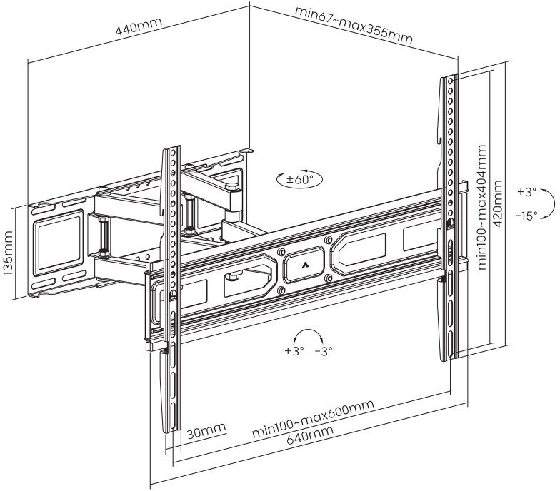 {Vertical adjustment} Κάθετα ρυθμιζόμενο. {Μέγιστο βάρος οθόνης} 40 κιλά. {Οριζόντια προσαρμογή} Με οριζόντια ρύθμιση. {Πρότυπο VESA} 100 x 100 mm . {Type} Βάση τοίχου . {Μέγιστο μέγεθος οθόνης} 80'' . {Curved Screen Compatible} Συμβατό με Curved Screen. {Ελάχιστο μέγεθος οθόνης} 37''. {Οριζόντια περιστροφή} -60° / +60° . {Boom} Με μπουμ . {Χρώμα} Μαύρο. {Type} Κλίση . {Αριθμός προσαρτημένων οθονών} 1 . {Τηλεχειριστήριο} Όχι. {Κάθετη κλίση} -15° / +3° . {Μέγιστη απόσταση από τοίχο/οροφή} 35,5 cm. {Ελάχιστη απόσταση από τοίχο/οροφή} 6,7 cm