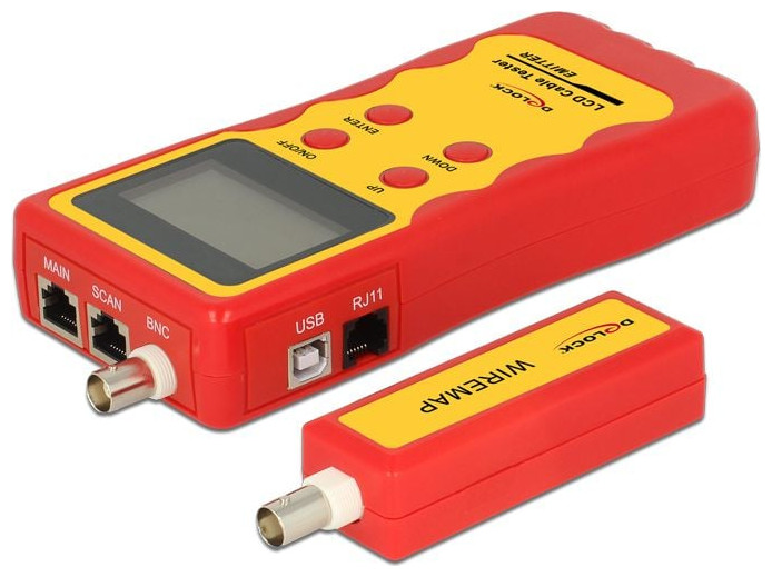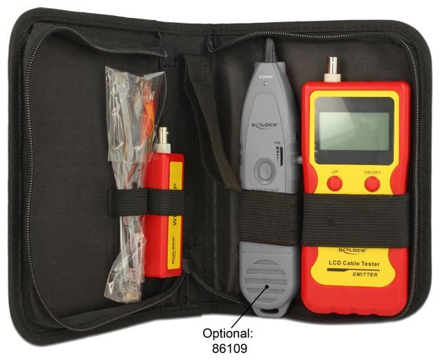 Przy użyciu testera przewodów firmy Delock można testować różne typy przewodów szybko i łatwo. Dostępne są złącza dla przewodów modularnych, przewodów sieciowych, przewodów BNC i USB. Błędy występujące w ramach mapy połączeń są wyraźnie wyświetlane na podświetlanym ekranie LCD. Przewody sieciowe można testować pod kątem zamienionych par, które mogą obniżyć skuteczność działania poprzez występowanie przesłuchów. Ponadto można mierzyć długość podłączonych przewodów. W celu testowania już zainstalowanych przewodów można używać modułu zdalnego.